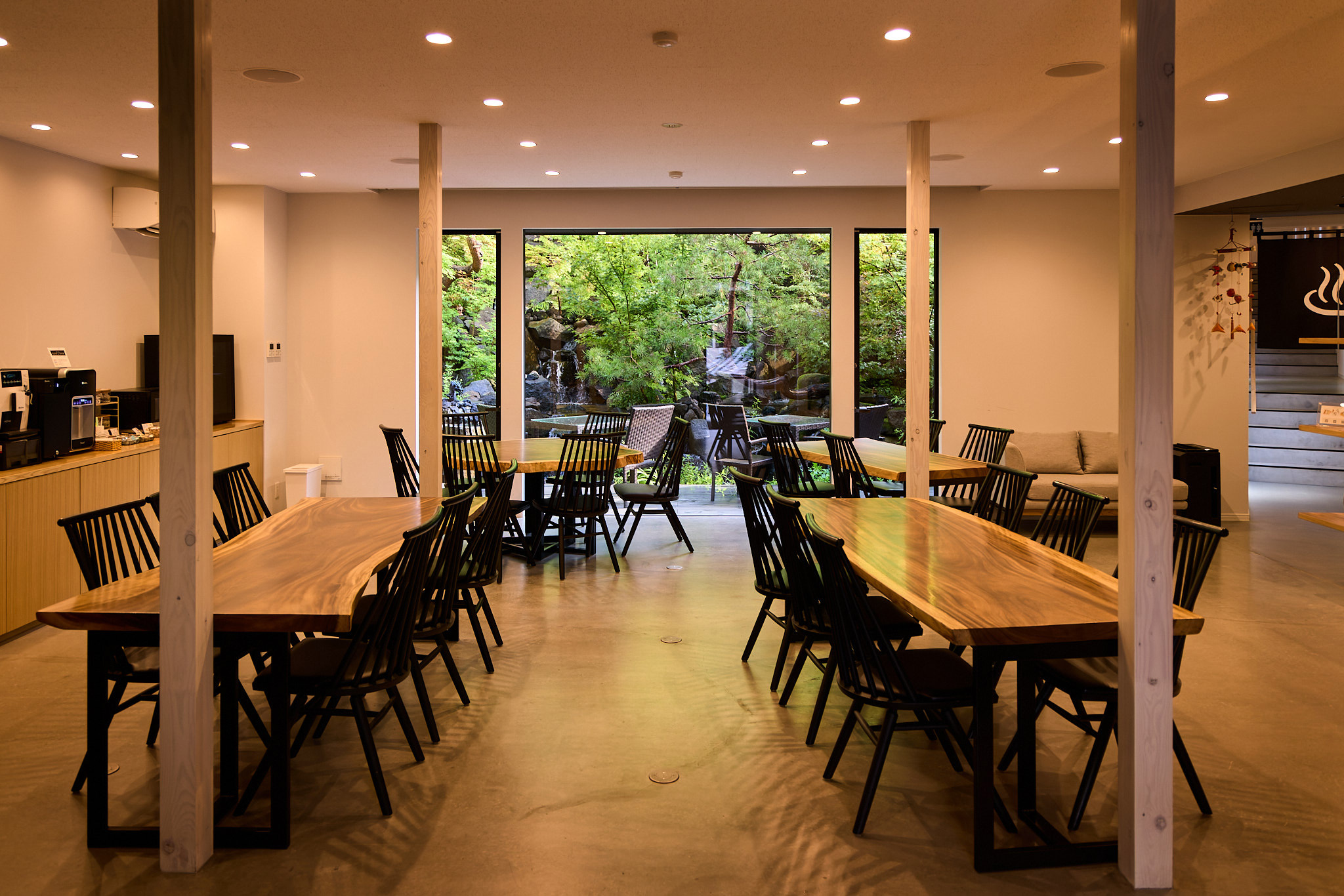 大判ガラスによって外部の景色を取り込むダイニング、一息つけるテラス、フリードリンクコーナーを設置。