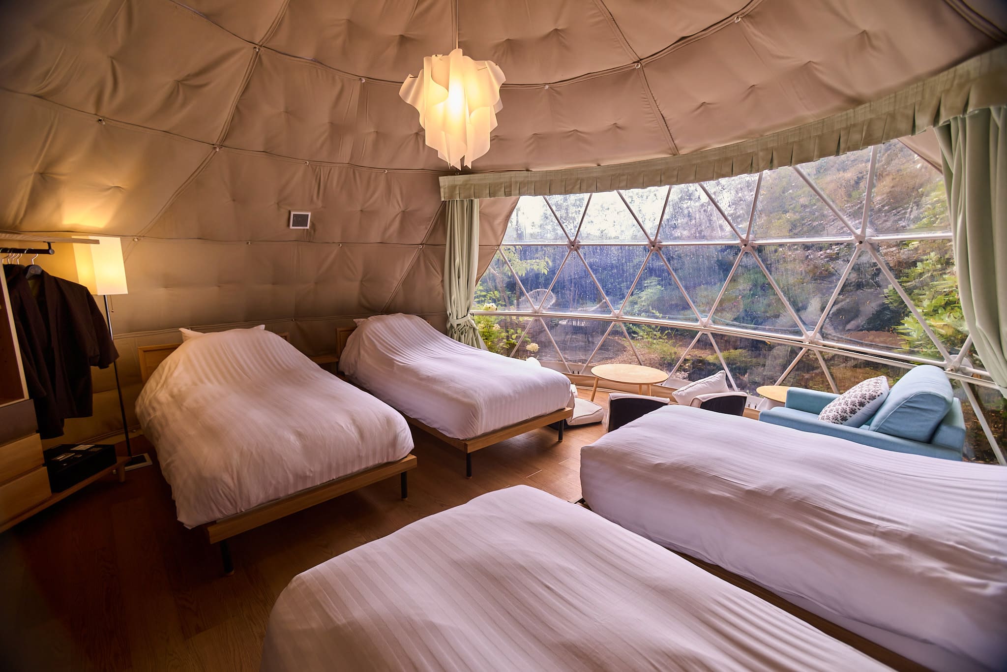 ツインルームからグランピングテントまで多彩な客室のラインアップ。ごゆっくりお寛ぎください。