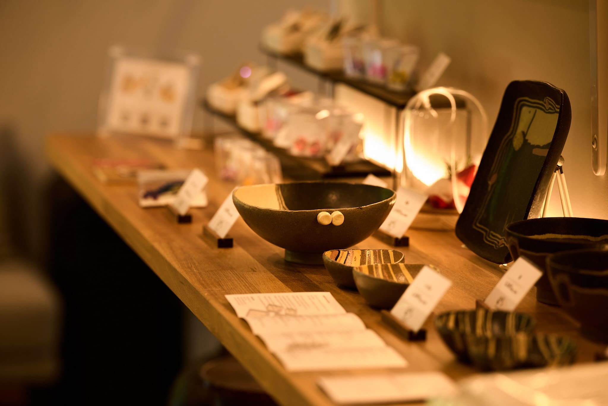 ダイニング横に地元産の工芸品やアクセサリーを展示・販売しております。真田幸村ゆかりの品は必見です。