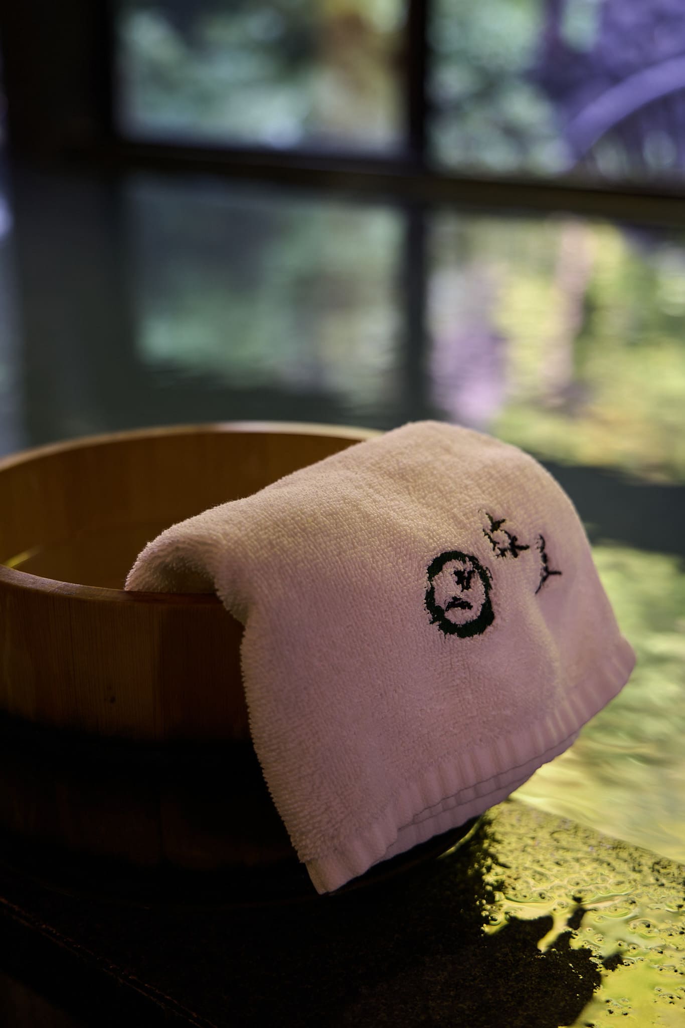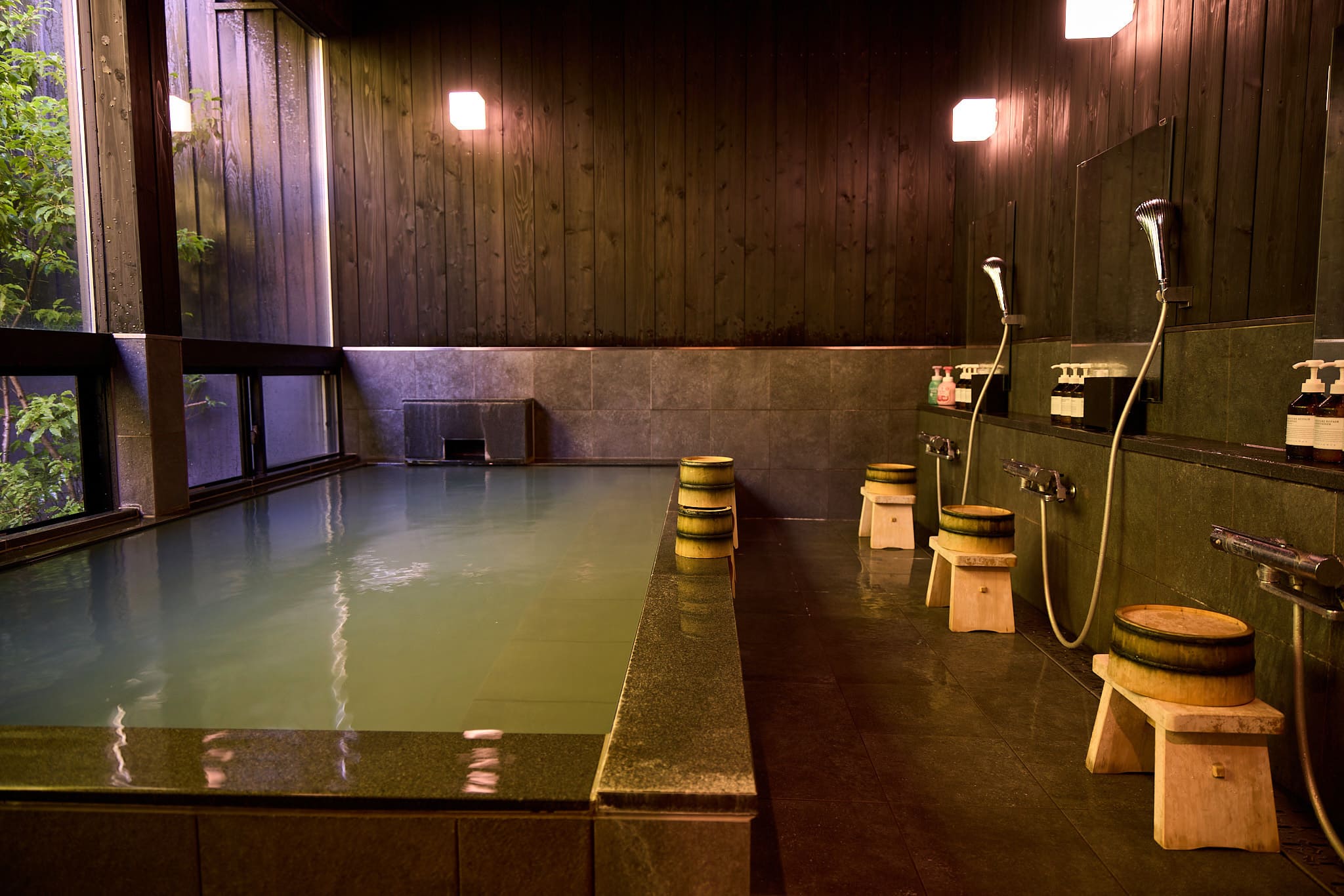 「山水の湯」は、1階ダイニングを背にし、貸切専用風呂エリアの2番目にございます。内風呂、露天風呂から庭園をお楽しみいただけます。翌朝11:00まで一晩中ご利用いただけます。