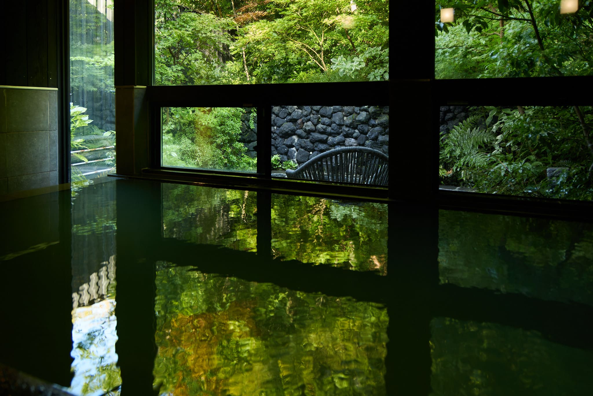 1階ダイニングを背にし、貸切専用風呂エリアの1番手前にございます。内風呂、露天風呂から庭園をお楽しみいただけます。翌朝11:00まで一晩中ご利用いただけます。