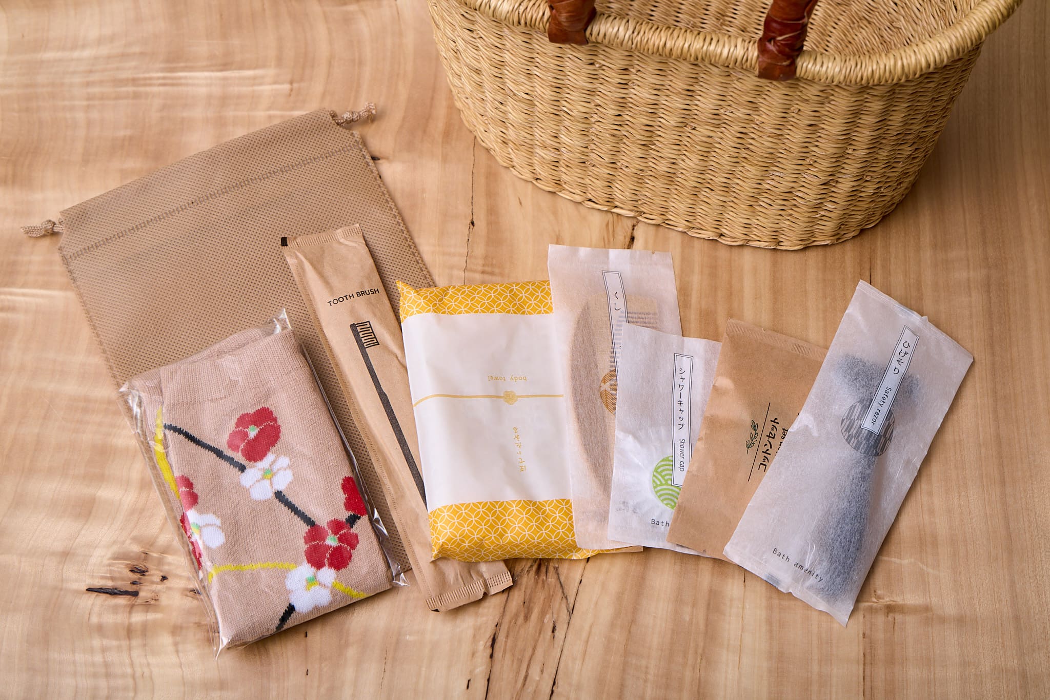 お部屋にアメニティセットをご用意。雪駄、靴下、歯ブラシ等各種アメニティグッズをセットしております。