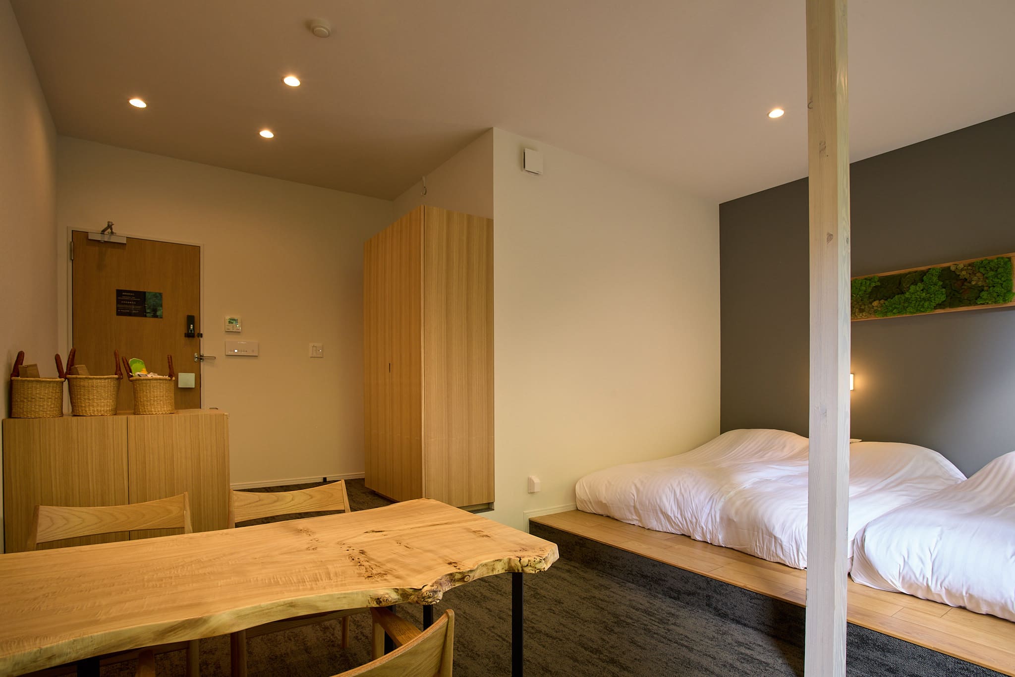 各客室は「桜」「椿」「紫陽花」など植物の名前が付けられております。窓の外に広がる庭園には、部屋名にちなんだ花や木をお楽しみいただけます。客室は総部屋数11室 洋室が4つのタイプで10室、グランピングが1室。別所温泉では珍しいベッド数3台、4台のお部屋もございます。ご家族やグループでのご利用や、一人旅まで幅広くご利用いただけます。
