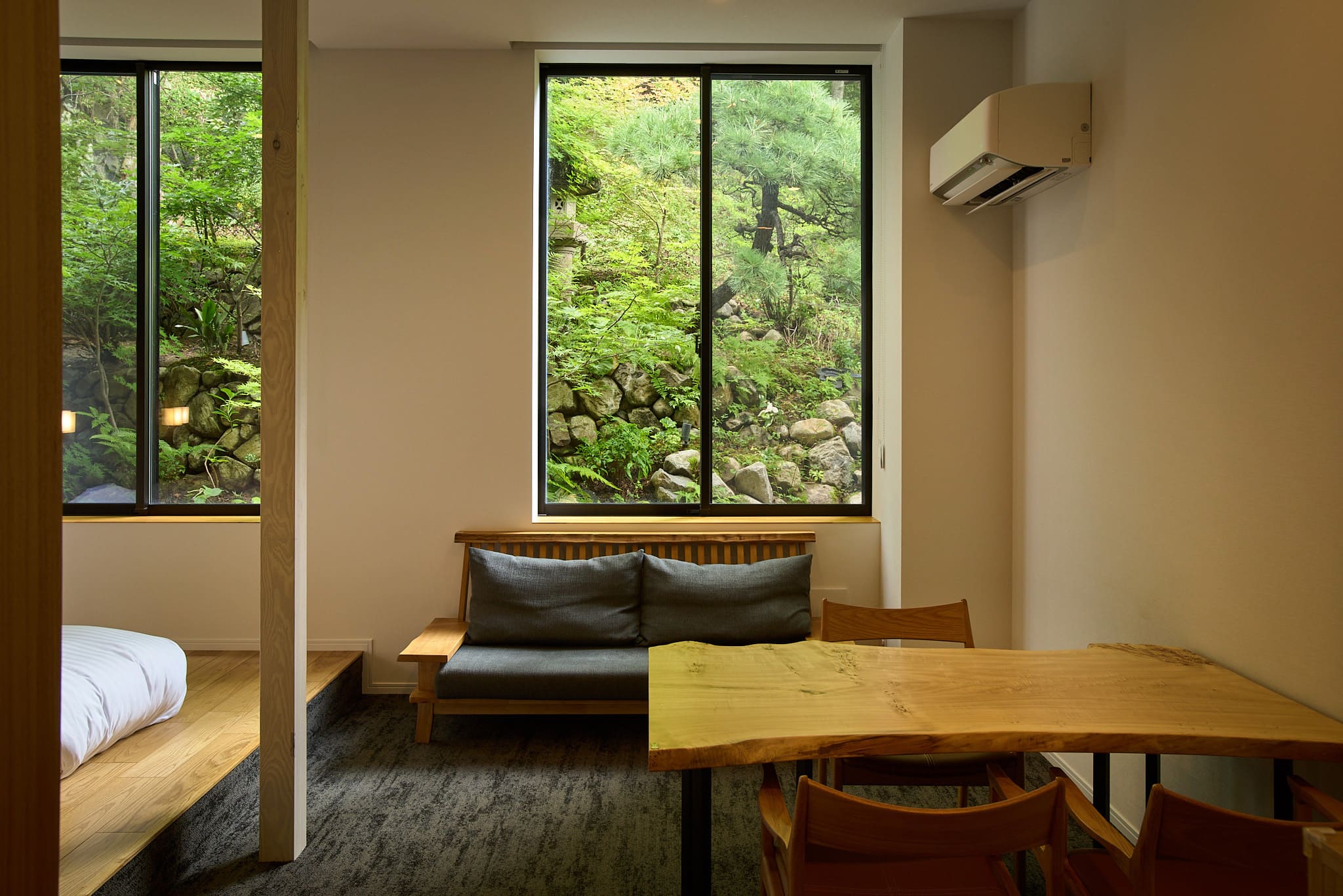 1階デラックスルームは、石原和幸プロデュースの庭園が目の前に広がるお部屋です。四季の移り変わりを心ゆくまでお楽しみいただけます。シングルベッド3台、ローベッドのお部屋です。ベッドを寄せて親子で並んで就寝することも可能です。脚の高いベッドが不安なお子さまや、赤ちゃん連れも安心してご利用いただけます。