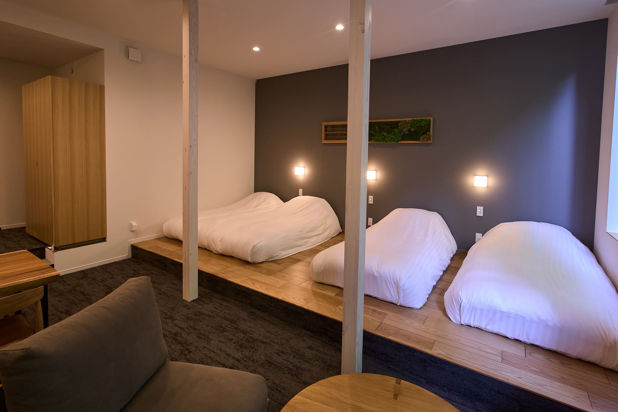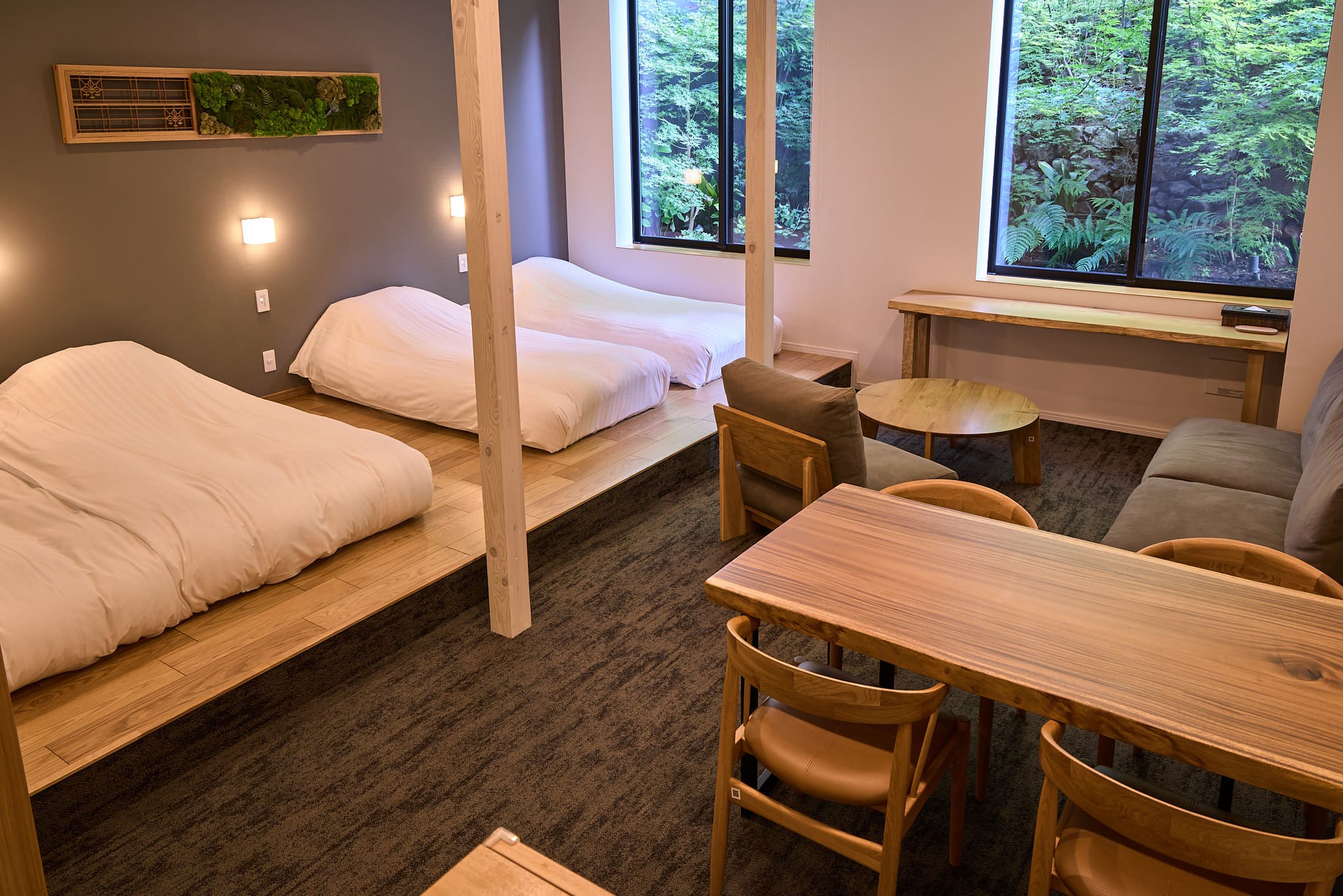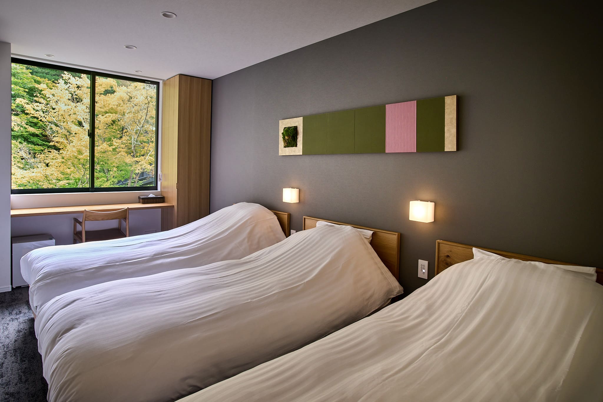 2階のファミリールームは、シングルベッド3台のお部屋です。お子さま連れファミリーやグループのご利用におすすめです。お部屋の窓から石原和幸プロデュースの庭園をお楽しみいただけます。