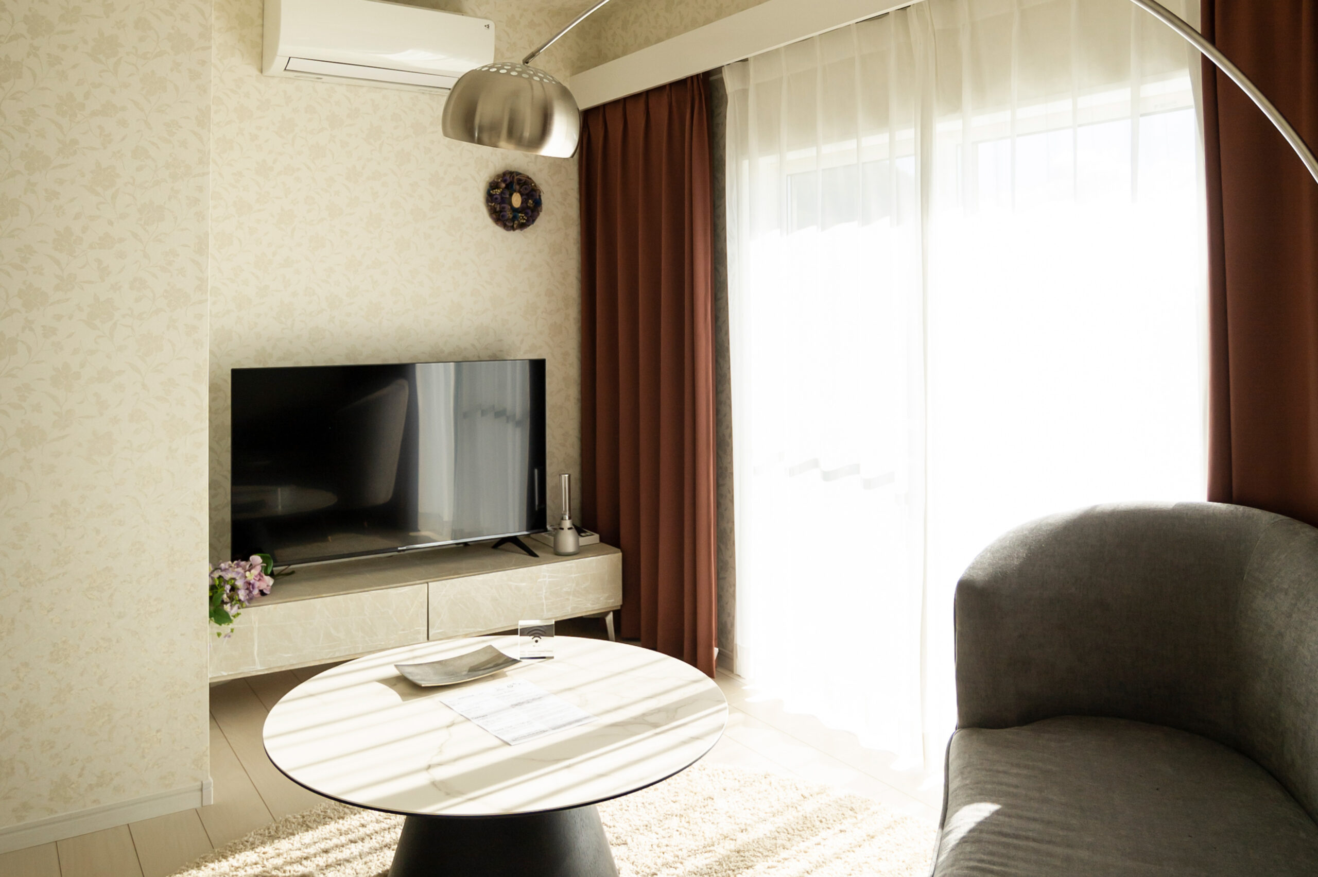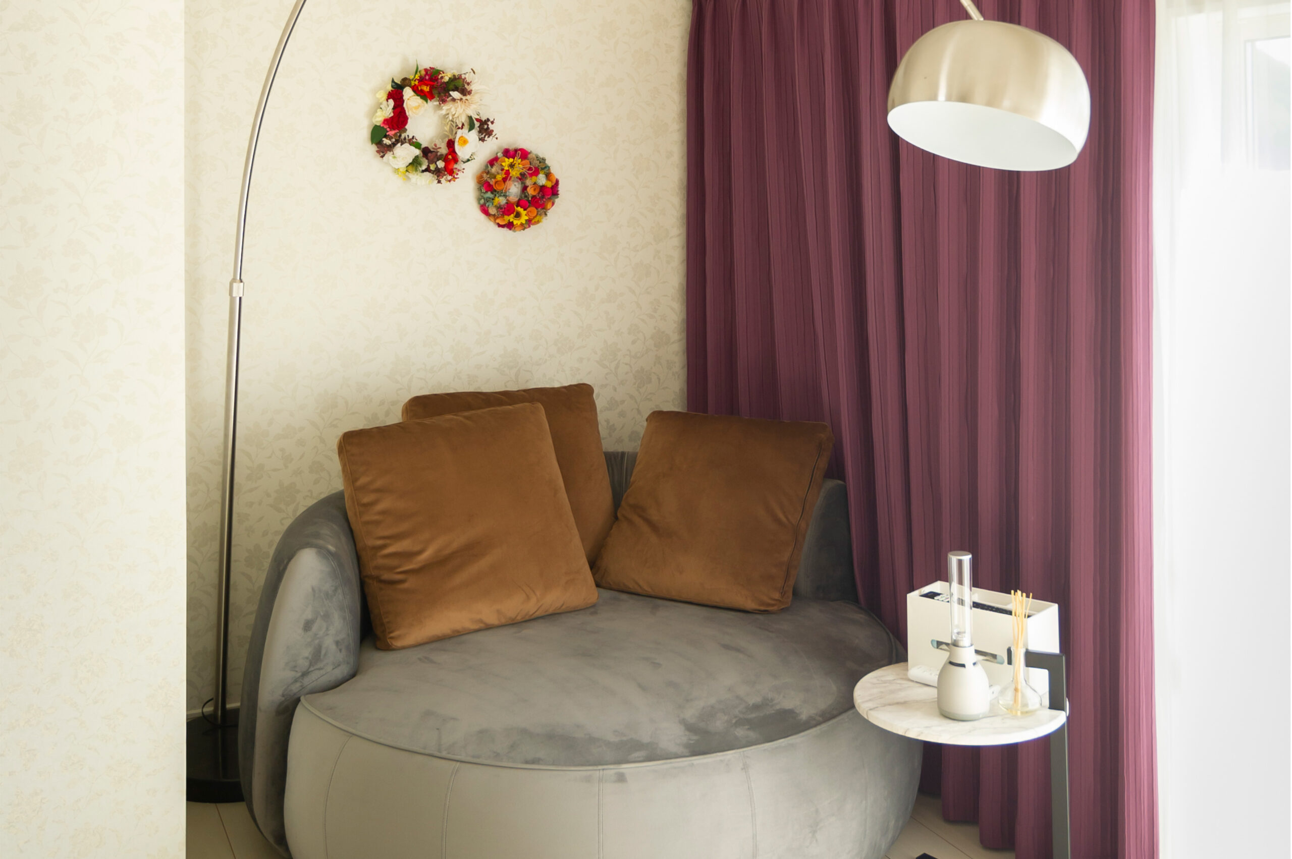 添い寝のお子様でしたら2名様までご利用いただけますが、追加の寝具のご用意はございませんので、あらかじめご了承ください。室内にはソファをご用意しており、ワインレッドのカーテンが上質な雰囲気を演出しております。