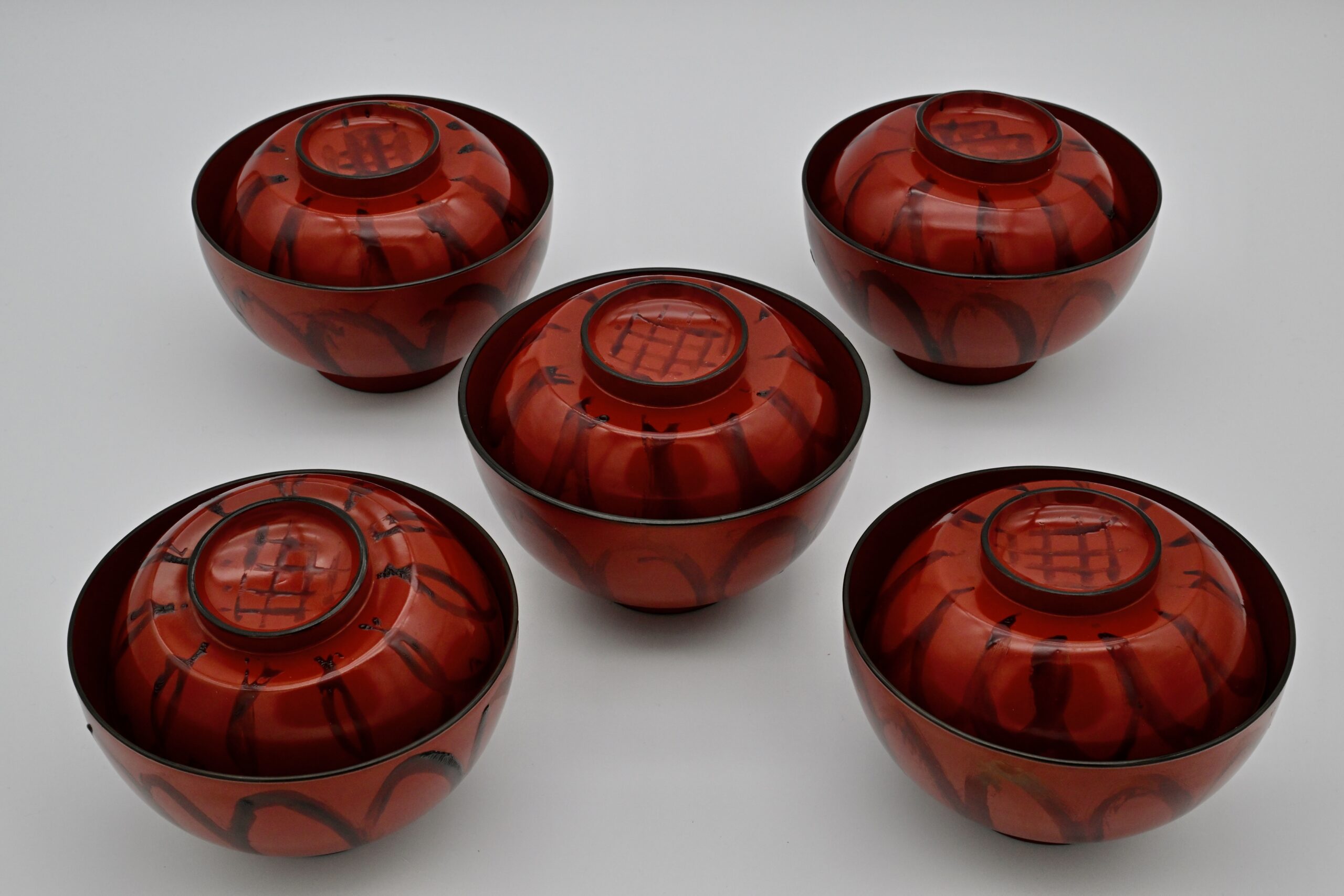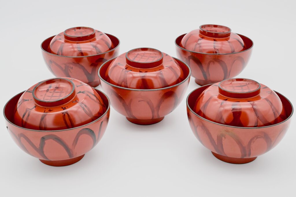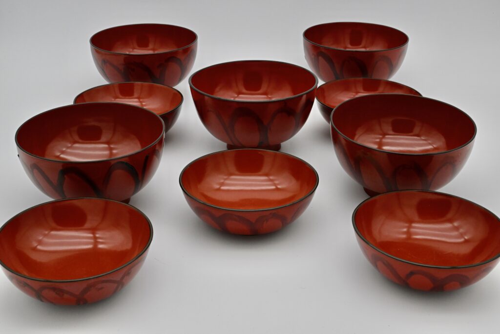 本作品は菊文の御膳とともに伝わったお椀です。お椀(煮物椀)は懐石料理や茶事の中でも最も重要なものとなっています。魯山人先生は戦時中、窯から火が出せないこともあり石川県山中や富山県の城端塗など漆の作品を多く制作しました。お椀の蓋の摘みの中を芯と言いますが、その部分には菊の筒状花(中央の部分)を簡略に描いたと思われ、それ以外の蓋の部分と身の部分には花弁が描かれている。本作品は昭和30年頃の作品です。