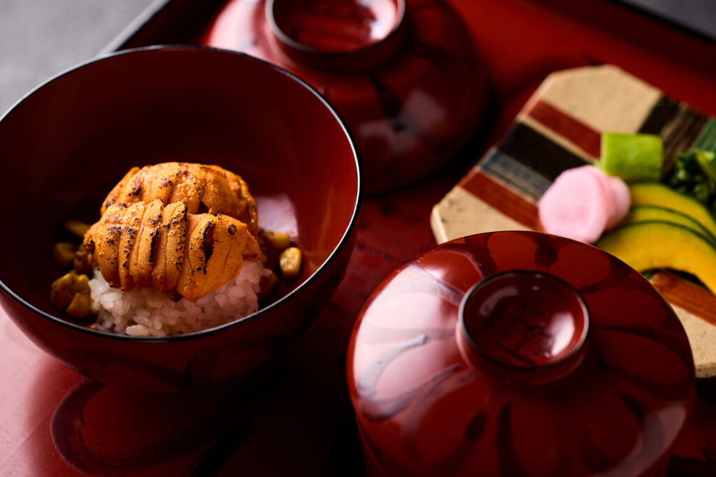 本作品は菊椀とともに伝わったもので朱塗の御膳の中央に大きな菊を描いています。菊は不老長寿の意味をもち古来より好まれて用いられてきました。この形は宗和膳という形といい、折敷が足付膳に江戸時代から使われるようになったと言われています。向付と飯碗、汁椀をのせて茶事や懐石などで使っていただいたり、色とりどりの酒器などをのせても楽しめます。趣向で展示用の台としても展開ができると思います。昭和20年~30年頃の作品の作品です。