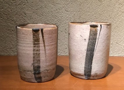 魯山人先生はビールを大変好み、いつもサッポロの瓶ビールの小瓶を愛好されていたようです。志野作品に大きな手付の麦酒呑があります。またちょうど湯呑の大きさでは染付の蛍手のビール呑があり、本作品と同じように底部にガラスを入れてビールを楽しませる作品となっています。ガラスを入れることにより清涼感が増しています。やや桃色を呈した御本手のような素地に鉄絵の太い線と細い線が配されています。こうした一本の線も大芸術家である魯山人先生ならでは美しい線です。晩年の作品です。