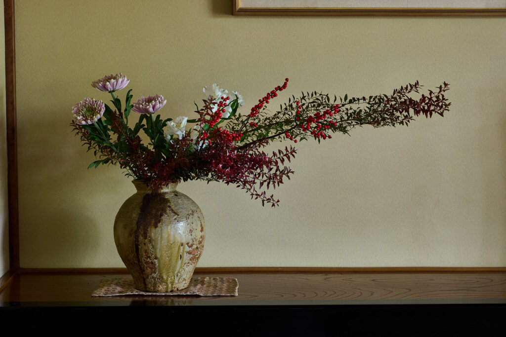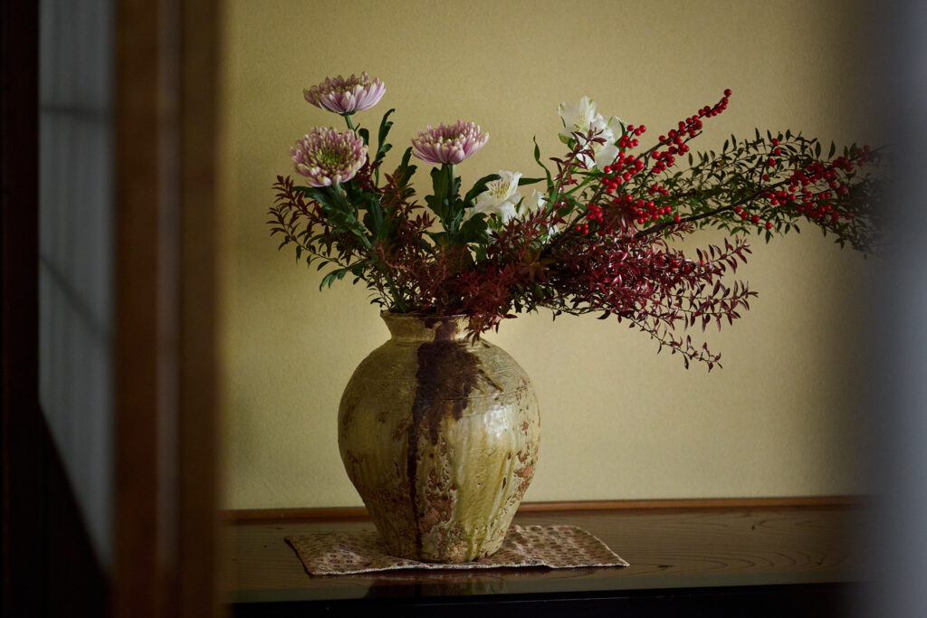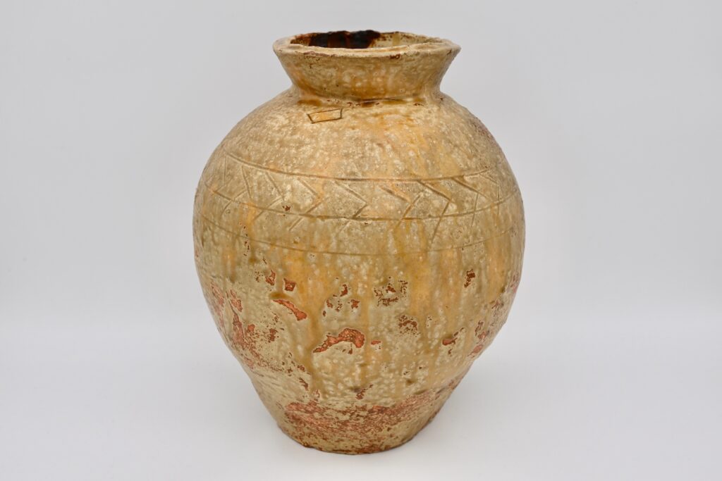 最晩年作品。その形状は、古信楽の壷をもとに造形されており、伝統的な信楽焼の力強さを継承しつつ、魯山人独自の美意識が加えられている。特に注目すべきは、灰被りと鉄釉の打ち流しが生み出す強い景色である。この作品は、計算されたな灰被りの上に鉄釉が勢いよく打ち流されることで、対照的な色彩と質感が生まれ、ダイナミックな装飾効果を生んでいる。加えて、桧垣文の装飾が施されており、伝統的な意匠と偶然性の妙が見事に調和している点も特筆すべき点である。昭和30年頃は魯山人が自由な作陶をさらに追求していた時期であり、本作にもその創造性と審美眼が存分に発揮されている。単なる花生にとどまらず、一つの芸術作品として完成された、非常に趣向を凝らした逸品といえる。