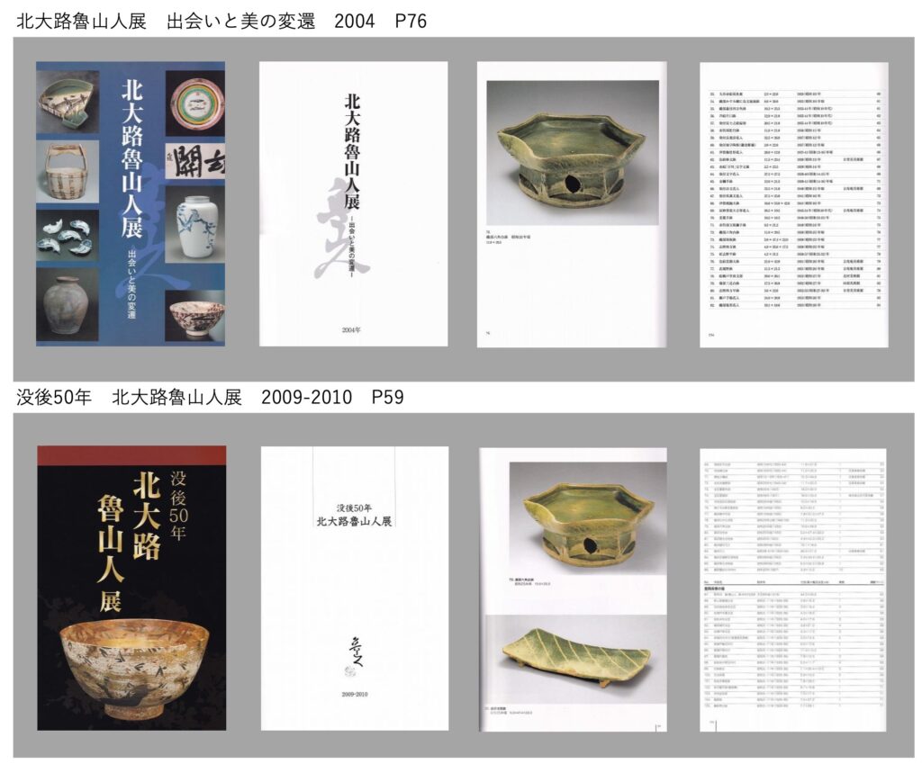 本作は、織部釉を施した六角形の透かし台鉢で、昭和25年頃の作品。魯山人が得意とした織部釉と、個性的な六角形のフォルムが特徴的で、さらに器の台脚には透かしが施されている。現存する台鉢作品は少ない。また、本作品はこれまでに美術館で開催された北大路魯山人展などにも出品・展示され、その芸術的価値の高さが認められている。魯山人の作品は、器単体としての美しさだけでなく、料理との調和を重視して作られており、本作もまた料理を引き立てる器としての機能性を兼ね備えている。六角形のフォルムと透かしの技法が生み出す陰影は、料理を盛った際にさらなる表情を生み、食の美を演出する器として完成された作品といえる。