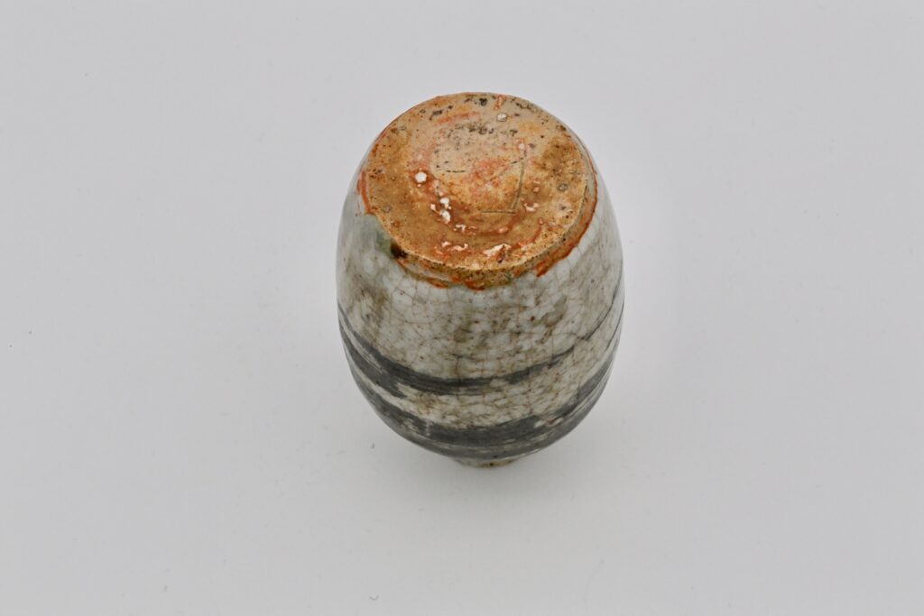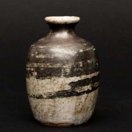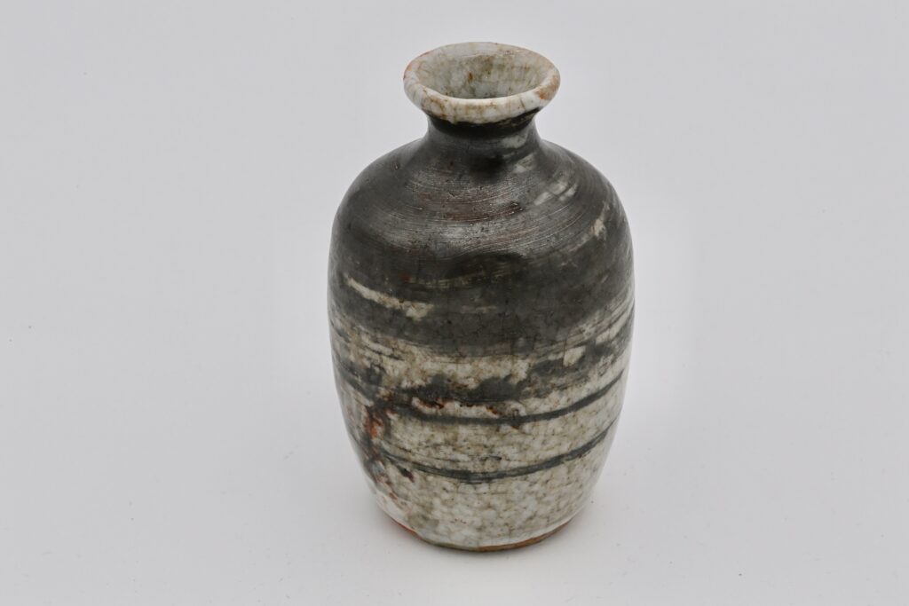 志野銀刷毛目徳利は、魯山人ならではの美意識が凝縮された逸品である。桃山時代の古陶磁を彷彿とさせる志野焼の風合いに、当時新たな試みとして取り入れられた銀彩刷毛 目を大胆に施した造形は、伝統と革新の融合を感じさせる。 製作から半世紀以上が経過し、銀刷毛目も落ち着き、器全体に深い趣が加わったことで、 いっそう美しさが際立っている。酒器としての品格を備えつつ、まさに「最高の酒の器」と 呼ぶにふさわしい仕上がりを見せている。