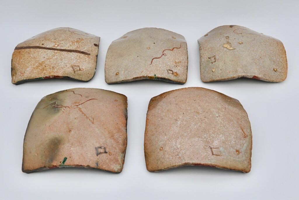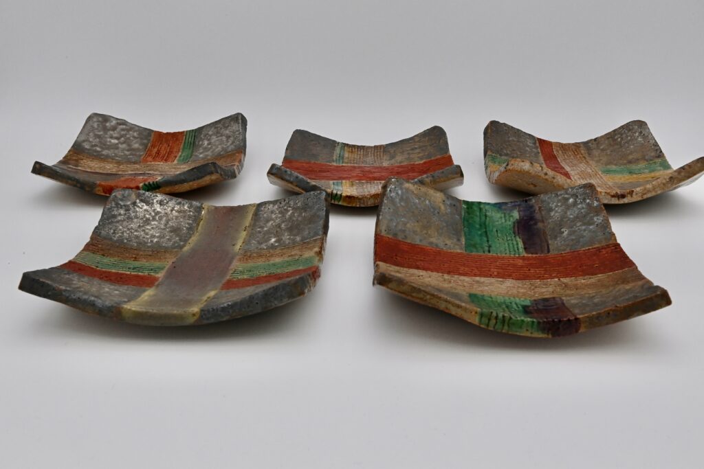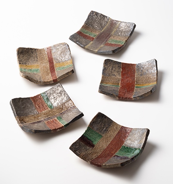 魯山人先生の晩年には叩きの仕事が多くなり大小の平向や平鉢を作っています。四方の隅を上げることでより立体的な作品となり、汁があるものなどにも対応できるものを作りました。本作品は十文字の櫛目を入れ糸巻の意匠が表しています。赤、黄、緑、紫などの華やかな釉薬を配して余白の部分には銀彩を施しています。器の裏側には糸の端が描かれているのが見所の一つです。本作品の類品が足立美術館などに収蔵されています。昭和30年頃の作品です。
