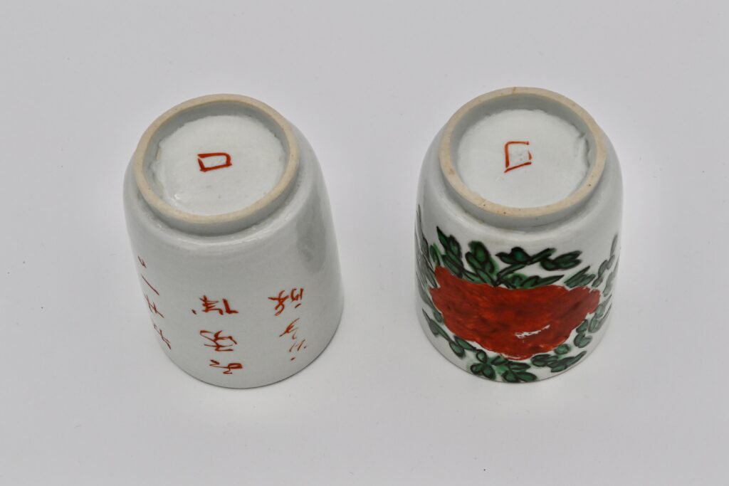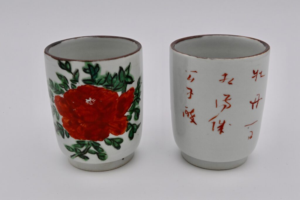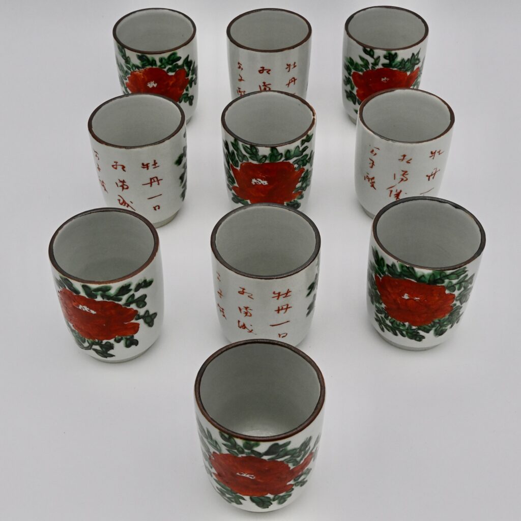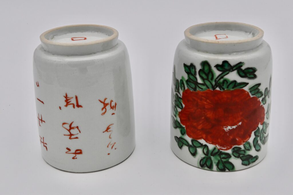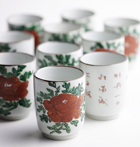 魯山人先生は多種多様の湯呑を作っていますが本作品は湯呑の王様とも言われています。牡丹は花の姿から「富貴花」「花王」と富貴と栄誉の象徴として古来から愛されているのにも起因しているようです。濃厚な赤呉須で花を力強く描き、葉を緑釉と黒で配しています。十客それぞれに雰囲気を変えているところに魯山人先生の美意識を感じます。裏面には「牡丹一日紅 満城公子酔」と赤絵で書されています。「松柏千年青 不入時人意 牡丹一日紅 満城公子酔」 (いつもでも青い松は 人の心を打たたない 一日の短い牡丹の花は 多くの貴族を喜ばす)中国南宋時代の詩が出典です。箱書に「筒」とあるのはぜひ筒向付としても使って欲しいとのご意向もございます。昭和30年頃の作品です。