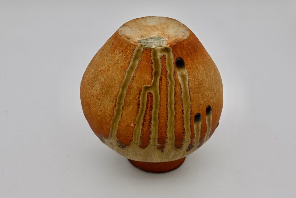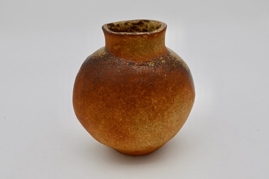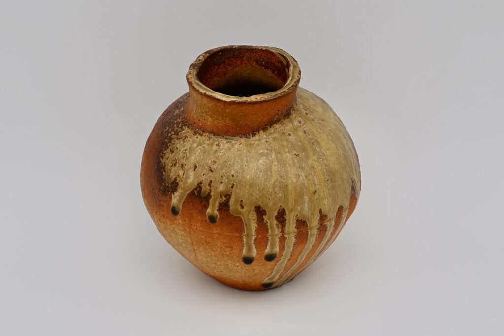 信楽土の壺、灰科の斜め掛けをした魯山人らしい作調。信楽焼の野趣を敢えて取り除き、上品な仕上がりになっています。魯山人は大きさと釉の流水を気に入り、二重箱も作成された壺です。