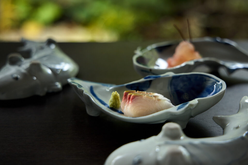 魯山人先生は大正8年に大雅堂芸術店を京橋(現在の魯卿あんの場所)に構え、二階で古美術の器を使って料理を供しました。評判が高く多くのお客様が集まるようになり星ヶ岡茶寮の礎になりました。古い器だけでは足りなくなり山代温泉の須田菁華の窯に出向き自身が制作を始めました。本作品は初期の代表的な向付として知られています。中国の明時代の末期に制作された古染付を基にしていますが、より彫刻的に仕上げて躍動感を演出しています。お茶事で最も長い時間、お客様のお手元に残る「向付」は重要とされて鑑賞に耐えるものでないと間が持たなくなります。この鯰魚の向付はそうした意味でも楽しませることの出来る作品となっています。昭和初期作です。