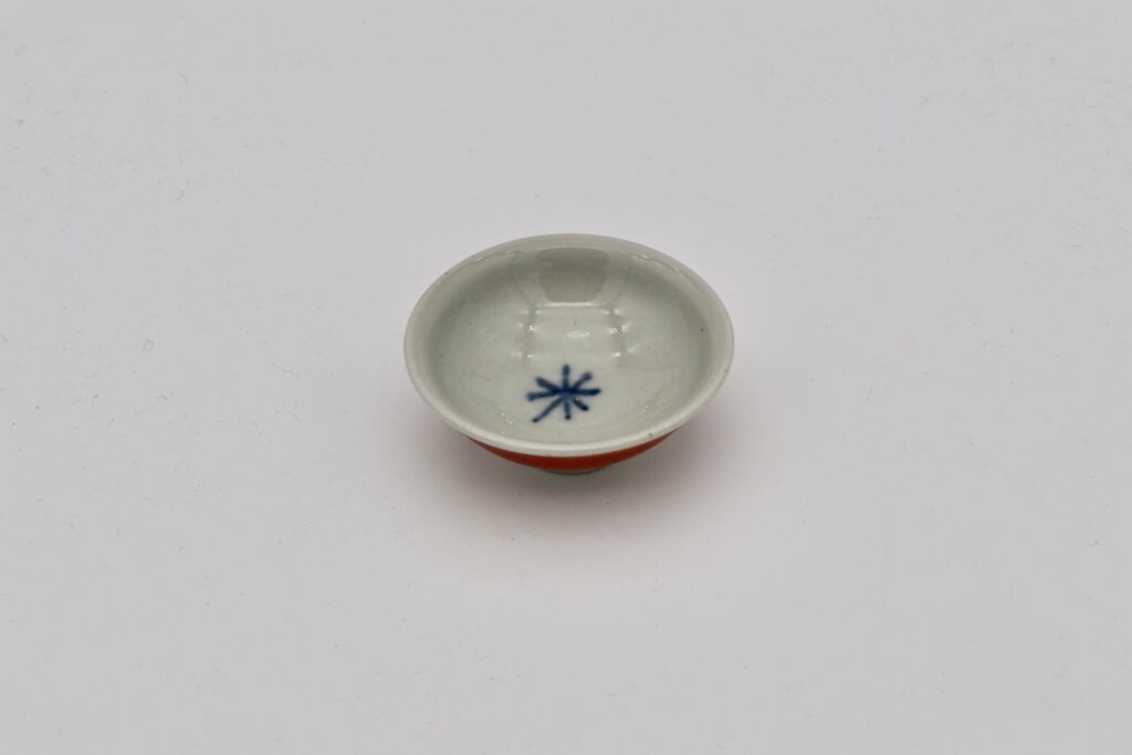 渋い赤がとても綺麗な酒呑です。中国嘉靖時代より400年もの間、これほど落ち着いた綺麗な赤呉須の色は、なかなか出すことは出来ませんでしたが、魯山人は茶渋を濾して混ぜる手法で、見事に素晴らしい落ち着いた色を出しています。