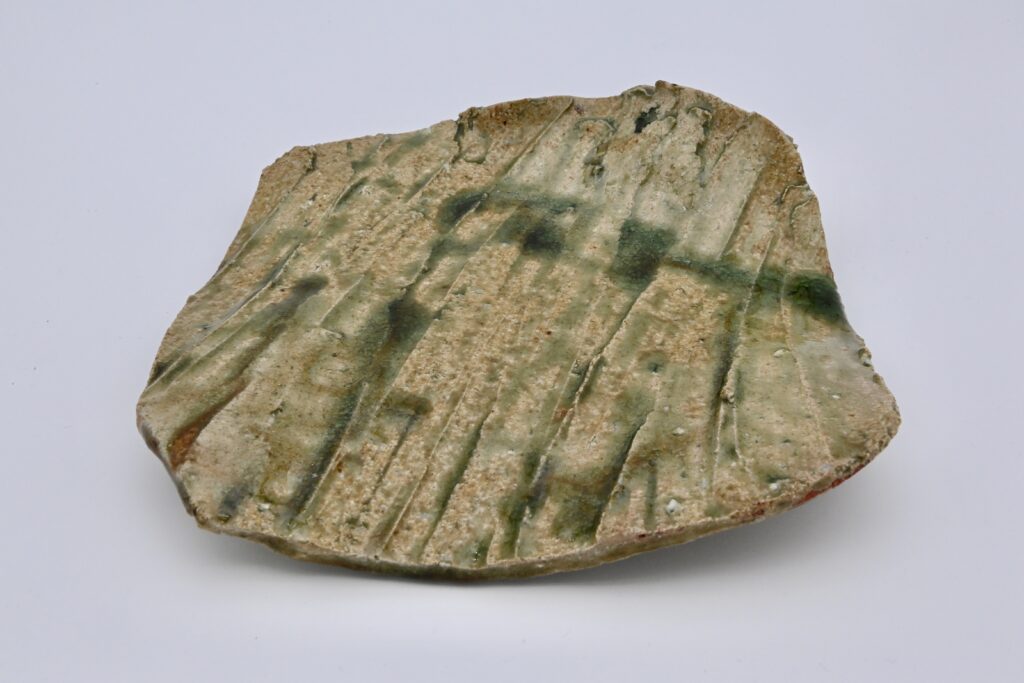 伊賀釉の鎬手の仕事としては若い時の作品で躍動的な所に魅了されます。単調にならないよう力強く一気呵成に削っています。灰釉とビードロ釉が美しく溜まっています。昭和 8年頃の作品です。