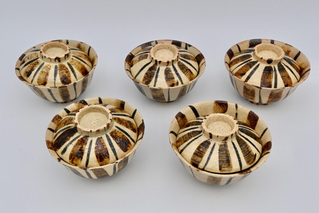 魯山人の飯碗で代表的な麦藁手。個々に違う表情を見せる仕上がりは魯山人ならではで、その時の感覚で絵付けをし、筆の流れが自然である。H8.2~8.9×W12cm 各高台内に描き銘「ロ」。
