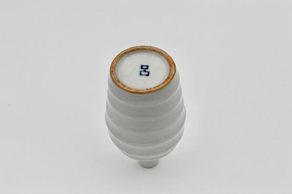 千利休所持の古瀬戸水指に五段の捻貫の形状のものが伝わっています。お正月にいただく縁起の良いチョロギ(丁呂木)などから来ている形とも考えらます。美しくも滋味深い白磁として口縁のみを皮鯨のように鉄釉を施しています。段のところが手がかかりとなり持ちやすくお酒をつぎやすくなっています。この形で赤呉須や赤呉須の金彩なども魯山人先生もこの形を気に入っていたようです。高台内に「呂」と染付銘があり昭和10年代後半の作品です。
