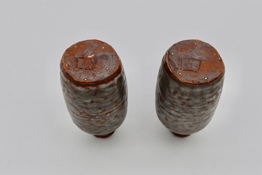 この徳利はやや鼠がかった志野地に螺旋状に銀彩が施されていますが、その螺旋の幅を大きくとっているために、少しだけ志野の地が見えています。その釉薬の対比も面白く、細身の形の徳利は数が少なく珍しい作品です。最初からこのような意匠を想定して作られたと考えられます。一対の作品は使っていない時に空間の室礼として飾ることも出来ます。晩年の作品で畳付きに「ロ」の刻銘があります。昭和30年頃のお作品です。