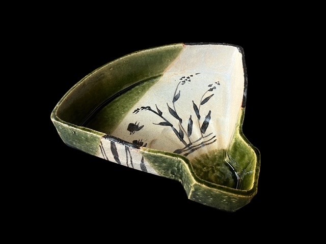 扇面のフォルムに千鳥と芦を配した情趣豊かな織部鉢瑞々しい織部釉の発色は抜群で、器肌に自然な濃淡をもたらしながら、絵付けと美しく調和している。さらに、鉢の側面には織部特有の幾何学文様が施され、造形と装飾のバランスが絶妙。鳥や芦といった自然のモチーフに、人為的な幾何が加わることで、静と動の世界がひとつの器に共存している。 魯山人が織部に取り組んだ背景には、桃山陶の自由闊達な精神への敬意と、それを現代に蘇らせる美意識があった。本作は、まさにその思想と技術が高次元で融合した一品であり、 「織部焼で人間国宝の認定を受けた」と評されるほどの完成度を備えている。なかでもこの扇面鉢は、料理屋や料亭が「魯山人作品といえば」としてひとつは持ちたいと願う代表的な意匠。器そのものが料理の格を引き上げるような、存在感と機能美を兼ね備えた逸品である。