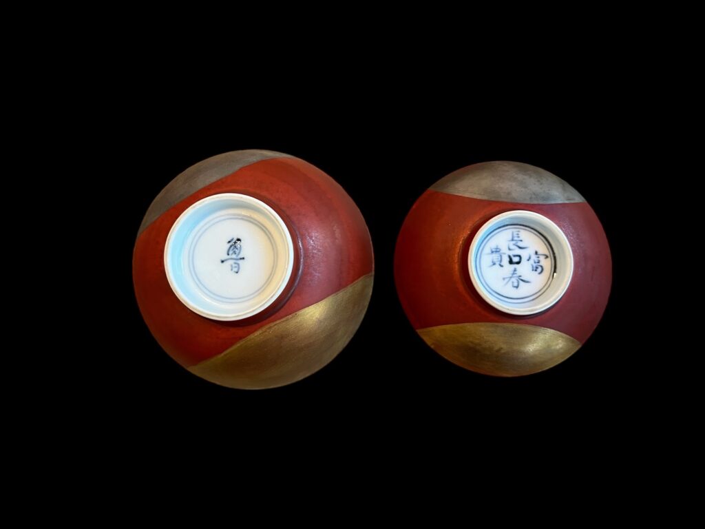 魯山人が漆器で多く手がけた日月文の意匠を、磁器という新たな素材で表現した極めて希少な蓋付茶碗。赤呉須で全面を塗り上げた磁器素地に、金で大きく日を、背面に銀で月を配した構成は、まさに魯山人の自由闊達な美意識と革新性を体現している。蓋にも金銀彩で日と月を描き、器と蓋が一体となって調和するデザインは、彼の「用と美」の思想が結晶したものといえる。図録にもほとんど掲載例がなく、市場に現れること自体が稀であり、黒田陶々庵識箱を備えた本作は、魯山人の芸術性を物語る貴重な資料である。作品の放つ格調と気迫は、まさに目利きをも唸らせる真の逸品である。
