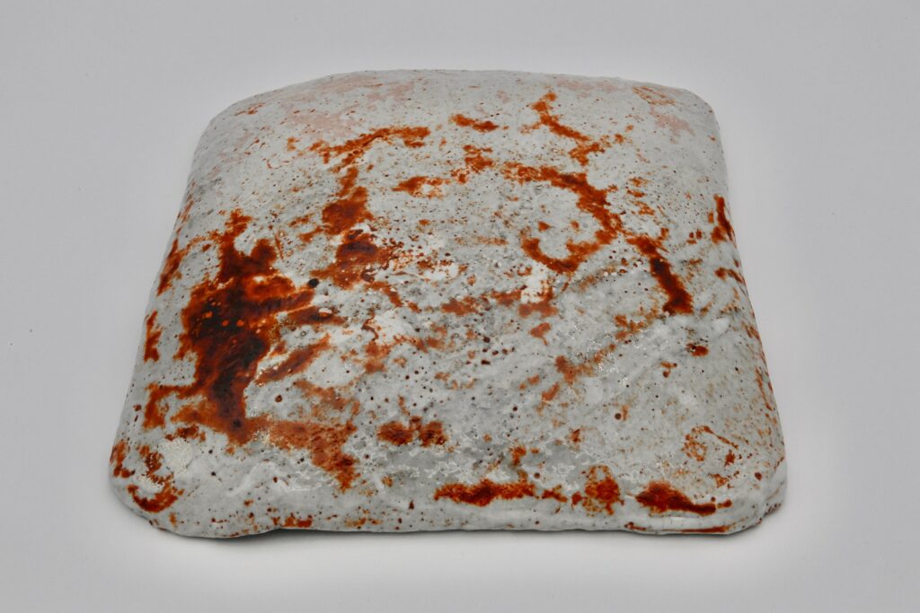 鉄分を多く含む鬼板を器面に大胆に施し、その上から魯山人が得意としたススキの文様を力強く掻き落とし、さらに全体を柔らかな志野釉で包み込み焼き上げている。鬼板の濃密な地に削り出されたススキ文様の線は、鋭さと繊細さを兼ね備え、秋の野に風が渡るような情趣を醸し出している。釉薬が溶け流れ、掻き落とされた線が霞むことで、まるで靄の中に揺れるススキのような幻想的な趣が生まれている点も見逃せない。魯山人の美意識が自在に息づく作品である。w 28.0 × d 28.2× h5.4cm 釘彫サイン「ロ」 1950年代