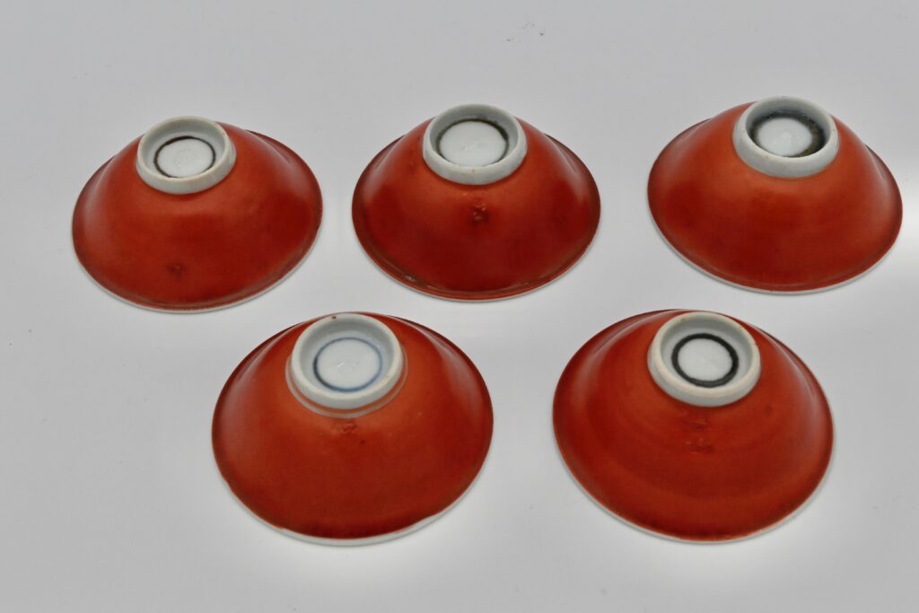 浅くひろがる端反りの盃形に、外面には深く艶やかな赤絵具が施され、内面は対照的に無地白に仕上げられている。赤と白の明快な色彩の対比が、視覚的にも軽やかな緊張感を生み出している。器形は一見簡潔でありながら、わずかに腰を張らせ、口縁に微妙な揺らぎをもたせることで、魯山人特有の造形美がさりげなく表現されている。また注目すべきは、山越弘悦によって調整された深みのある鮮やかな赤絵具である。その赤絵具は「古赤絵をも凌ぐ」とも称され、滲みと艶の間にある奥深い色合いの表情を出している。w 6.2 × h 2.7cm 印サイン「魯」 1920年代