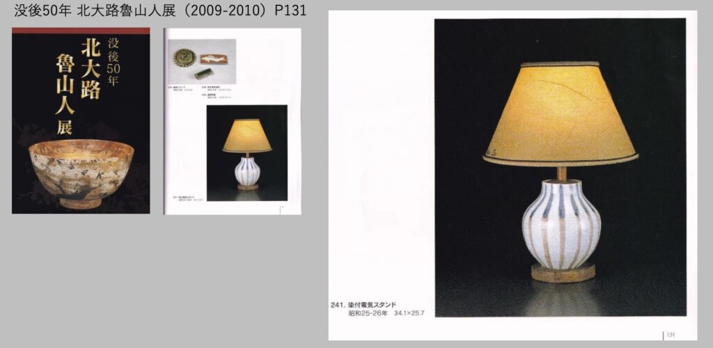 本作は、昭和23年に三越美術部で開催された「魯山人独創 第一回電気スタンド展」の出品作を想起させるもので、器物を単なる道具とせず、生活空間における美の象徴として再構築した、魯山人ならではの革新性が結晶した作品である。洋風の照明具にあって、和磁器の素材美と手仕事の品格を融合させた本作は、辰砂による柔らかな紅色と染付の青の縞文様を白磁に配した造形が特徴的で、垂直にのびる文様が壺形の丸みにリズムと動きを与えている。構造面においても意匠への徹底した配慮が見られ、口元ソケットおよび台座には、丈夫な木材を主に用い、機能部分を意匠的にカモフラージュし、革新的精神を象徴している。展覧会の趣意書において魯山人は、日本の真の陶磁器の価値が海外で十分に理解されていないことへの憂慮を述べ、電気スタンドという洋風生活具への応用を通じて「ほんものの」陶磁器を海外にも紹介しようとした志を語っている。そうしたことから、様々なタイプの壺・花瓶を西洋風のランプベースとして再構築し、既成の枠にとらわれぬ自由さと、美的実用性へと深く探究した。魯山人が日常生活の中に芸術が息づくことを願い作り上げた、時代を超える提案作品である。w12.5cm × h 34.0cm(シェード含む) サイン無し 1940年代 ※点灯ましますが、約80年前の電気部品です。ご使用には十分ご注意ください。