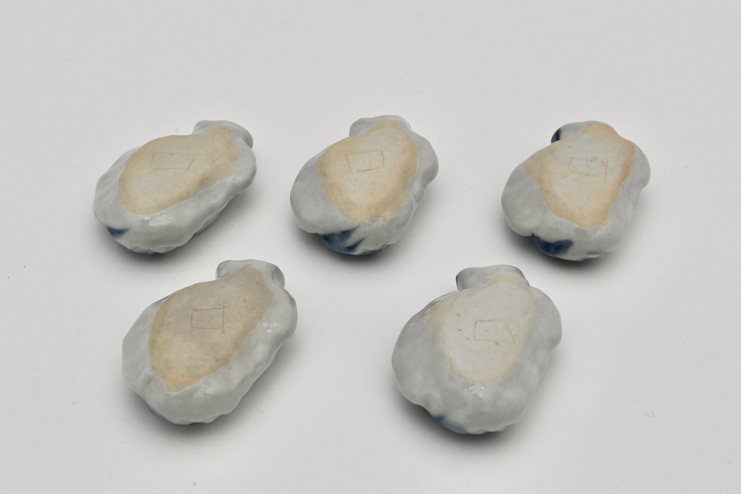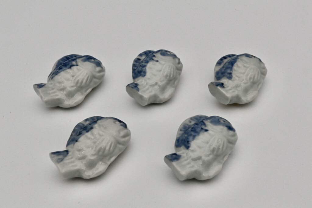 魯山人先生は様々な箸置を作っています。「流枕」などの文字を入れたもの鳥の形のもの、牡丹や双葉の形など特に魚のものを多く細身のもの、鯛でも薄めに作ってあるものもあります。また多様な釉薬を用いて同形のもので多様に展開してます。本作品は少し太った鯛を染付で作っています。6.3/4.3/H2.0cm