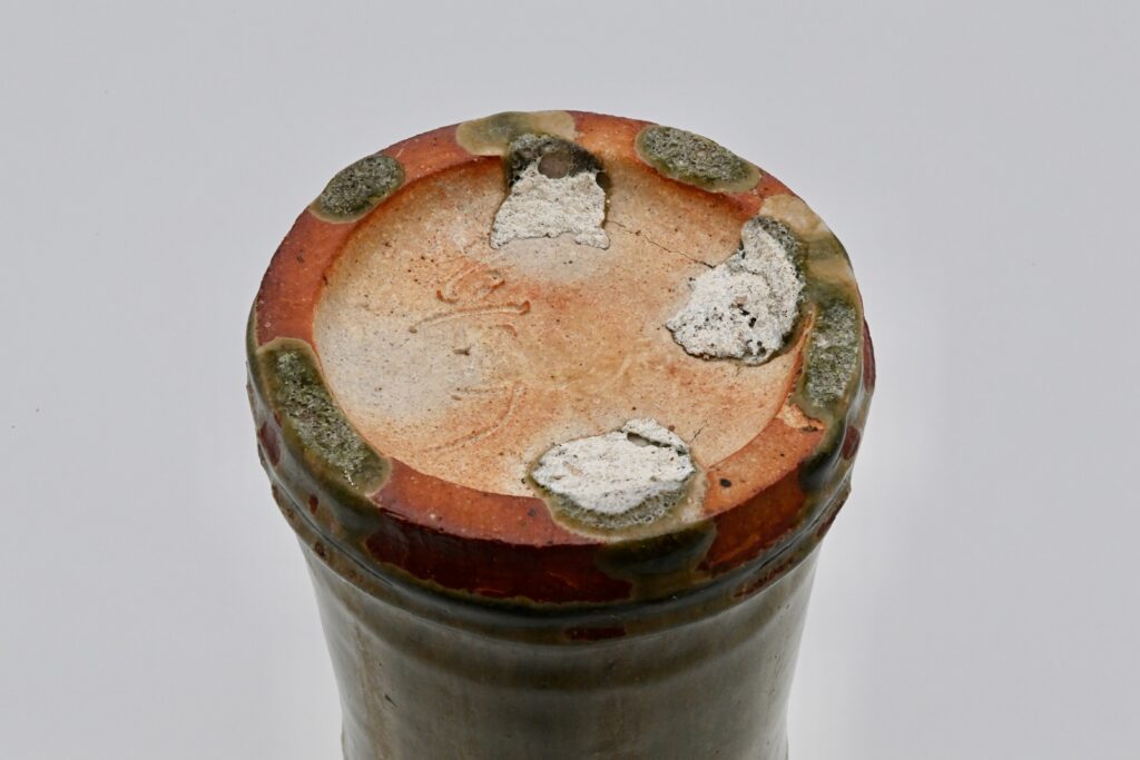 竹形の花入は、とても様子が良く、魯山人特有な焼き物の内の一つです。千利休以来、竹の花生けはとても人気が高く、現在でも茶道を好む人に限らず、たくさんの人が作ったり使ったりしています。魯山人はこの焼き物を伊賀釉で多数作りましたが、その中でもこの作品は形もしっかりして、釉薬がとても綺麗に掛かり、素晴らしい焼き上がりになっています。「没後50年北大路魯山人展」全国回った現物です。使い易い大きさで、床の間やテーブル等何処でも直に使える名作です。昭和15年(1940)頃の作品。11.0×11.0×26.8H (cm)
