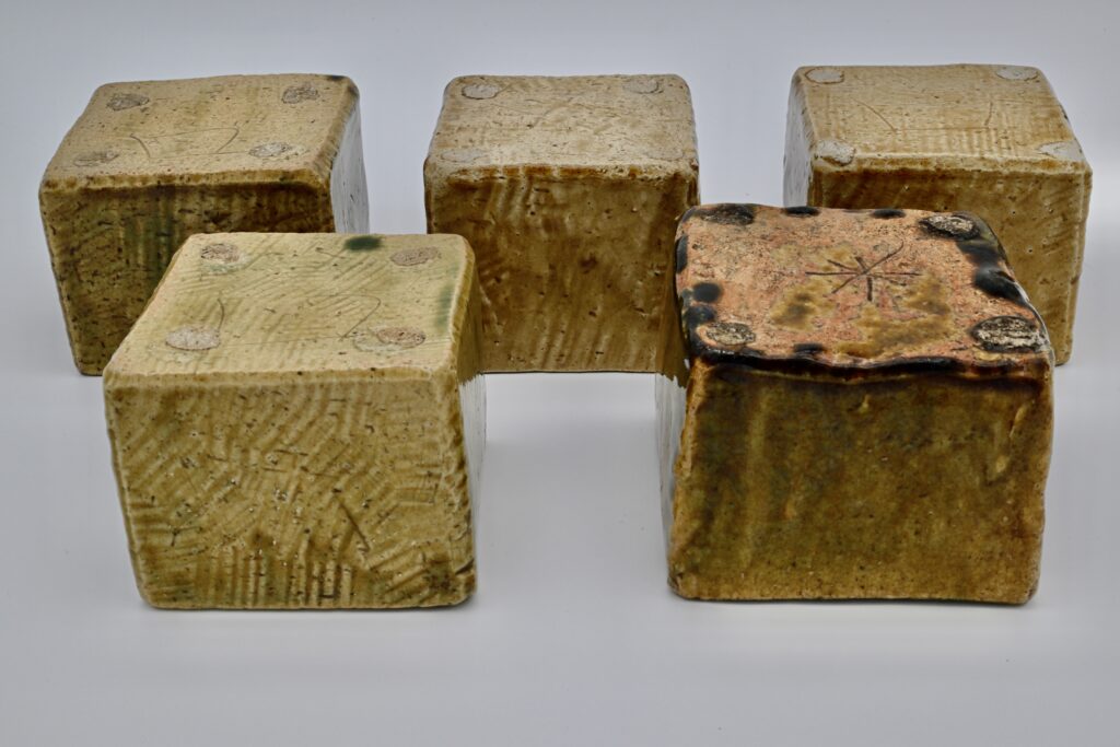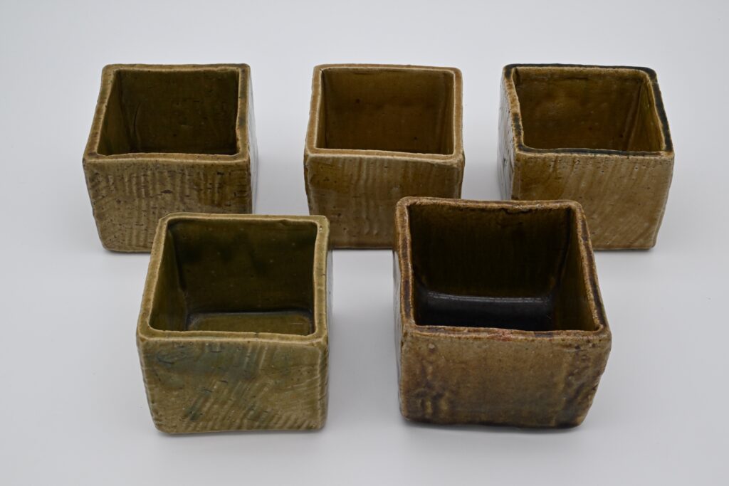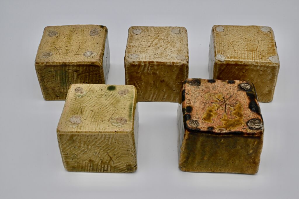 かなり厚手に作られた織部の向付です。乾燥時に鉋などを使って凹凸を出すことで織部の釉薬に陰影ができ、かなり彫刻的な作りをしています。氷を引き、金具を使い底上げし刺身などを出すことも出来ます。織部の色もまちまちで黄瀬戸に近いものから深い緑のものもありますが、登窯を使っていた魯山人先生はありとあらゆる釉色、釉調を出すことが出来たようです。