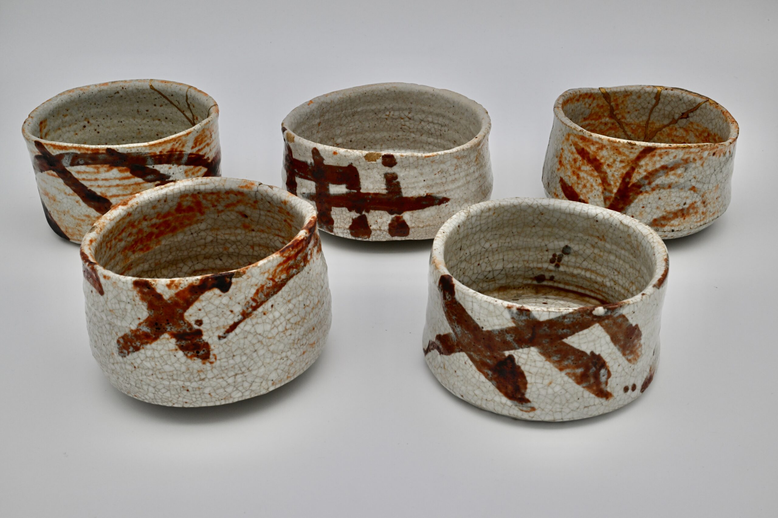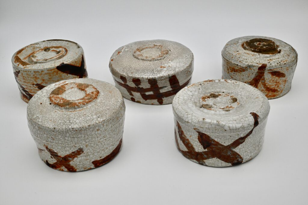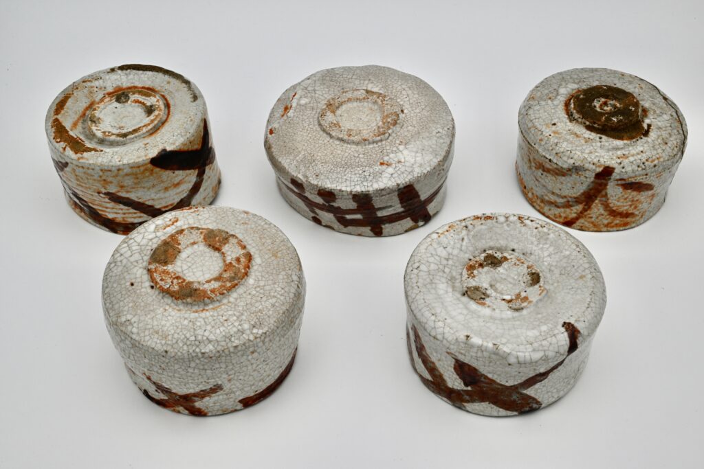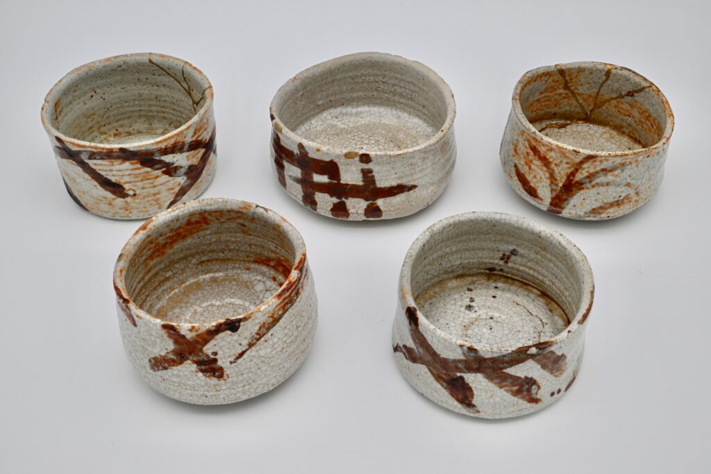 美濃陶との本格的な出会いは昭和5年に遡ります。魯山人窯に従事していた荒川豊蔵先生が当時、瀬戸産と思われていた志野を岐阜県の可児市久々井の大萱で筍の絵が描かれていた志野陶片を発見しました。魯山人先生は費用などを出し周辺の美濃窯の発掘調査をし、大体的に誌面などを使って発表しました。それ以降、志野や織部などの作品を本格的に作るようになりました。この魯山人先生の絵志野茶碗は一つでも貴重ですが五種あります。形や高台や釉調や鉄絵の絵付けを少しずつ展開しているのが面白いところです。昭和20年代の作品です。