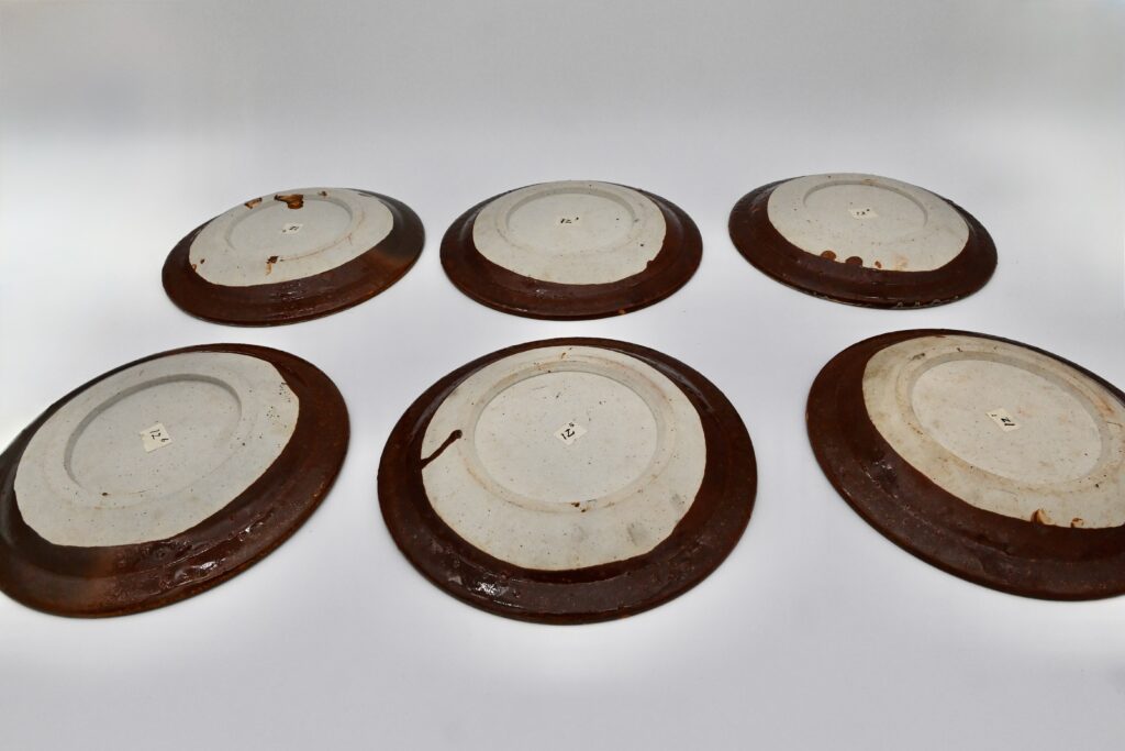 本作は、鮮やかな柿釉を基調とした平向に銀彩を施し、その表面を掻き落として草と虫の文様を描いた、北大路魯山人の装飾的感性が凝縮された逸品。そもそも釉薬は焼成によって生じる発色や景色に幅があるが、本作柿釉の焼き上がり自体は、魯山人本人が望んでいたような理想的な仕上がりには至らなかった可能性がある。しかしながら、それをあえて逆手に取り、銀彩を加えるという魯山人ならではの発想的装飾技法によって、器全体に新たな緊張感と詩情を与え、作品としてより高い完成度へと昇華させている点が特筆される。これは、素材の偶然性を受け入れつつ、それをさらなる表現へと導く魯山人の柔軟かつ大胆な芸術的姿勢をよく示している。微細な柿釉景色の上に銀彩を重ね、それを掻き落とし描かれた草文様は、まるで水滴が草に宿っているかのような瑞々しさを湛えている。その草の間にそっと潜むように描かれた虫の姿は、写実を超えて抒情性を帯び、器面に静かな物語性と季節感をもたらしている。草の線描は即興的でありながらも構成的な意図も感じられ、奥行きのある複雑な表情が生まれている。また銀彩の下に浮かぶ気泡状の痕跡は、水滴のように器面を点在し、全体に生命の気配を添えている。料理を引き立てるための実用器であると同時に、視覚的・触覚的に豊かな鑑賞陶としての価値も併せ持つ本作は、魯山人芸術の本質、自然と素材との深い対話を象徴している作品といえる。w 22.2 × h9.2cm。釘彫サイン「ロ」。1950年代