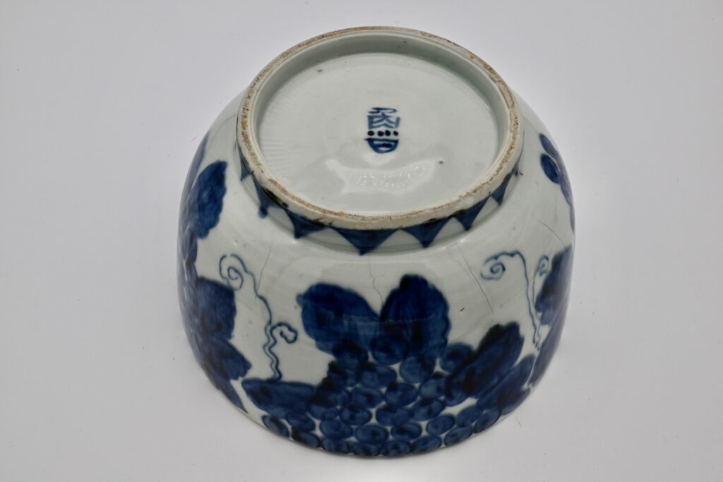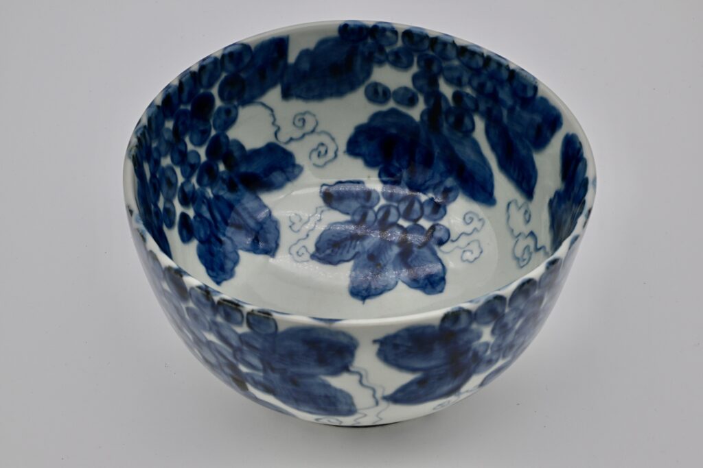 中国の明時代天啓年間頃から景徳鎮では雅味溢れる染付や赤絵が誕生しました。清朝の新渡の染付に対して古い染付ということで「古染付」と言われてようになりました。当時日本人が事細かく注文したものもあり、到来してからは特にお茶室に適う素地が厚手に作られたものが特に珍重されました。この染付葡萄鉢も古染付の中では特に評価が高いものです。魯山人先生はとても多くの古染付をコレクションして便利堂から豪華本を二冊出版するほどに入れ込んでいました。この魯山人先生の鉢は古染付にただ倣うのでなく、より日本人の美意識に適う作品を作りました。葡萄の輪郭を陶磁器の性質を利用してぼかしました。見込みもまるでお花が咲いているかのようにぶどうや葉や蔓を描いています。高台内には「魯」の染付銘があります。昭和10年代の作品です。