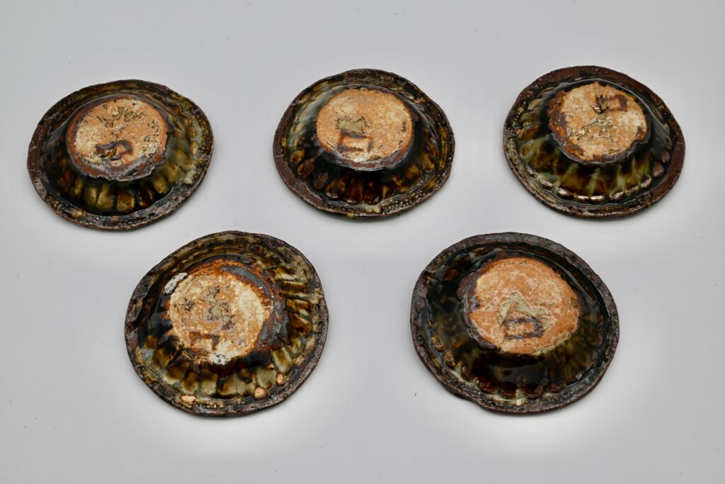 とても可愛らしい小皿です。軒先の丸い瓦と菊花からヒントを得たようです。青味がある清涼感のある釉薬と口縁には鉄絵を配しています。珍味入れとしても重宝しそうです。「ロ」の鉄絵銘があり昭和30年頃の作品です。8.7~9.1 / H1.3~1.5cm