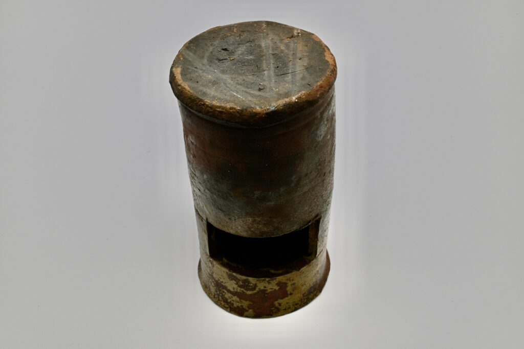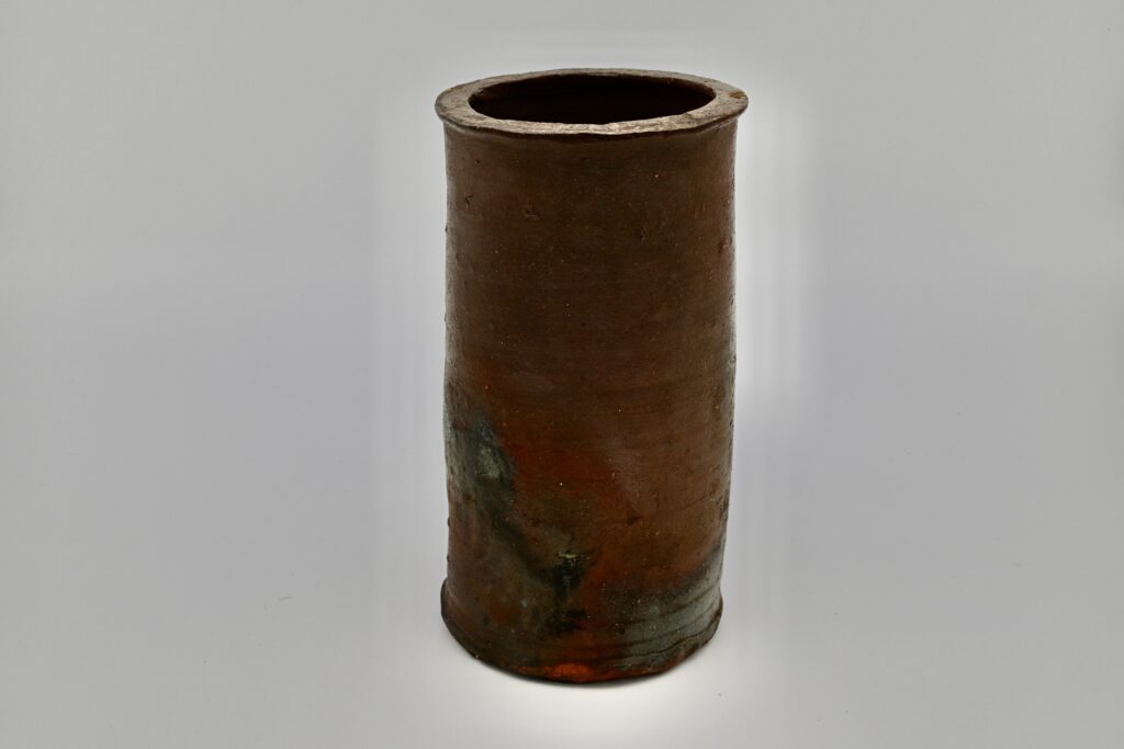 茶の湯に深く精通していた魯山人が、伝統的な竹の花入を備前土で独自に表現した逸品。自然の竹筒の姿を写し取りながらも、堅牢で重厚な存在感を備え、土味の力強さと造形美が見事に融合している。花を一輪添えることで空間全体に凛とした緊張感と気品をもたらす、まさに茶席にふさわしい堂々たる佇まい。花窓が設けられており、床間に置き筒花入としてもお使いいただける実用性も魅力。用の美と精神性を兼ね備えた、魯山人ならではの花入。