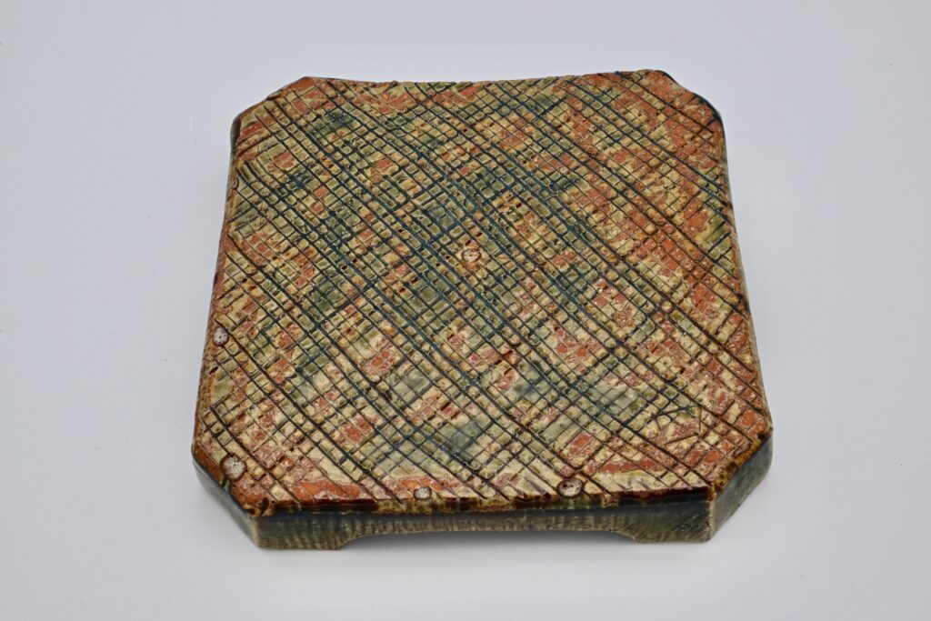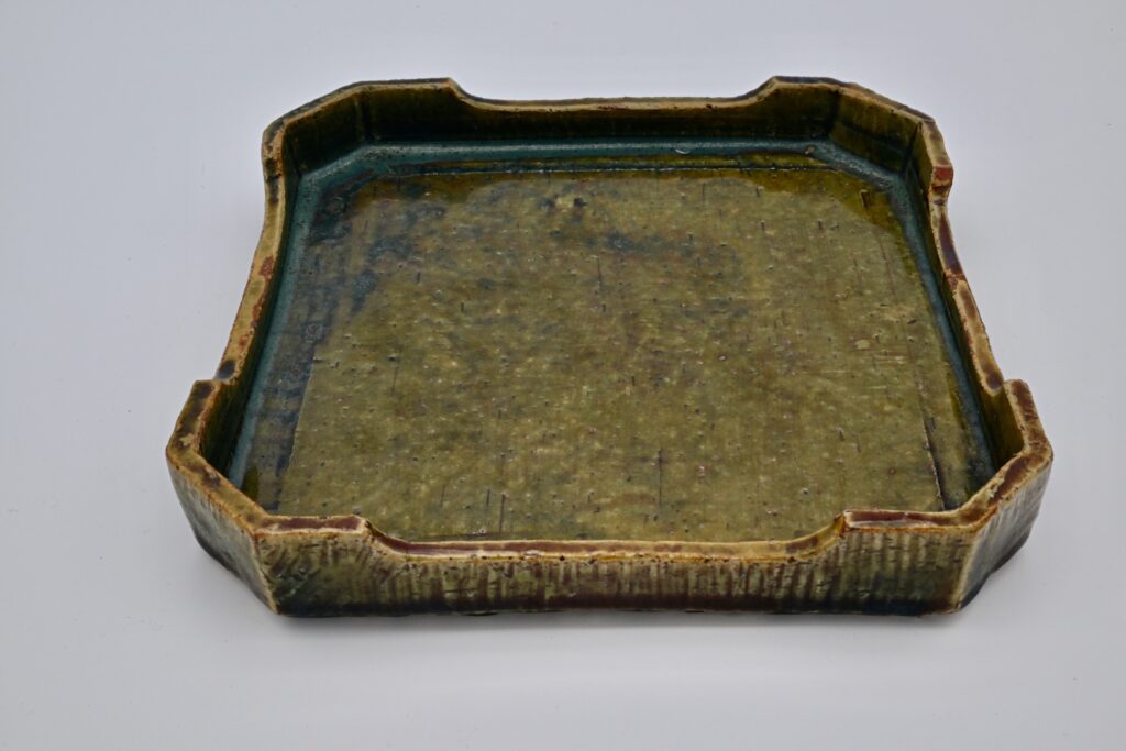 魯山人晩年の作品で、箱は友斎によるもの。完成度の高い造形に加え、魯山人独特の仄かに辰砂がかった織部釉が見事に発色し、誰にも真似できない独自の美意識と技術が凝縮された逸品である。四方のしなやかな立ち上がりと端正な造形は、八寸の器として料理を包み込み、盛り付ける食材の存在感を際立たせる。織部釉の深みと光の映りによる表情の変化は、眺める角度ごとに異なる美しさを見せ、食卓を一段と豊かに演出する。魯山人織部の中でも抜群の出来栄えを誇る、まさにこの上ない名品。