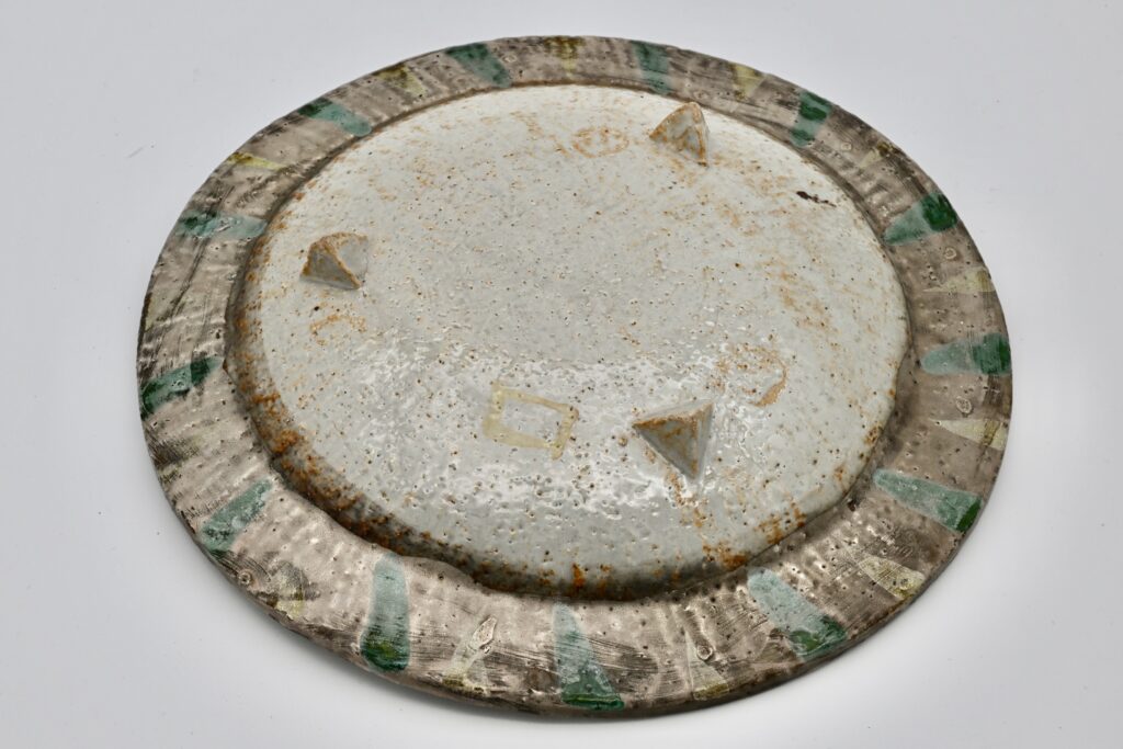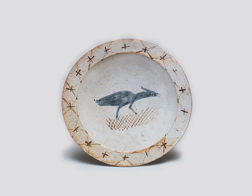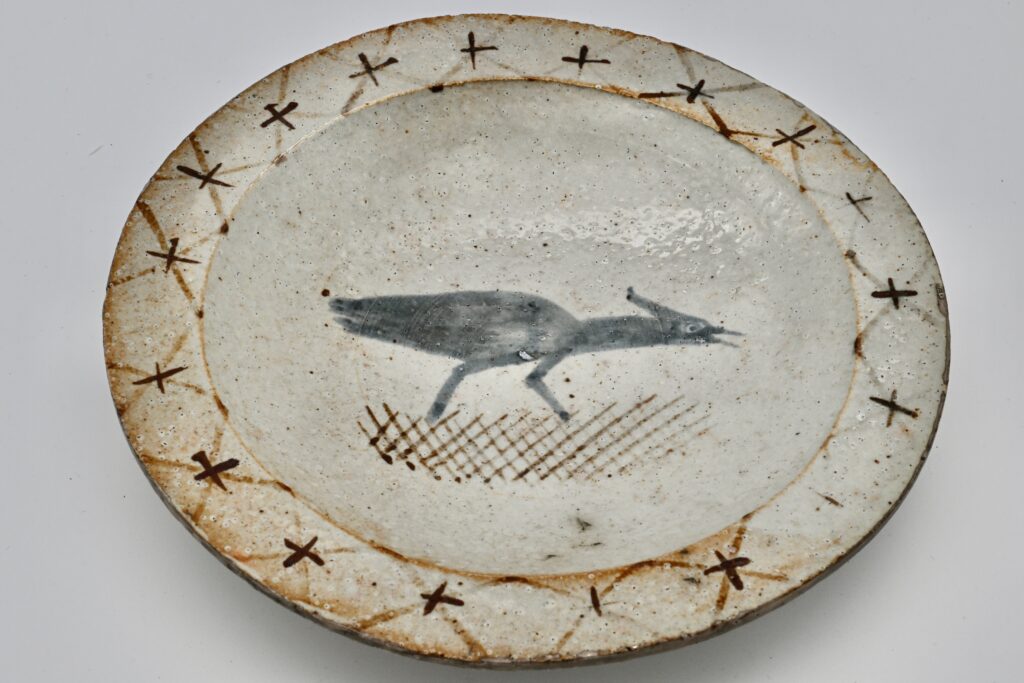 皿の縁に籠目文様を、見込みには水鳥が水辺を歩く様子を描く。獲物でも狙っているのであろうか。無駄な線を使わず簡略化されながらも、その表情は魅力的で愛嬌がある。1954年に欧米へ渡った際、ピカソやシャガールなどに影響を受けて作った作品のうちの一つである。高4.2×径24.3 cm