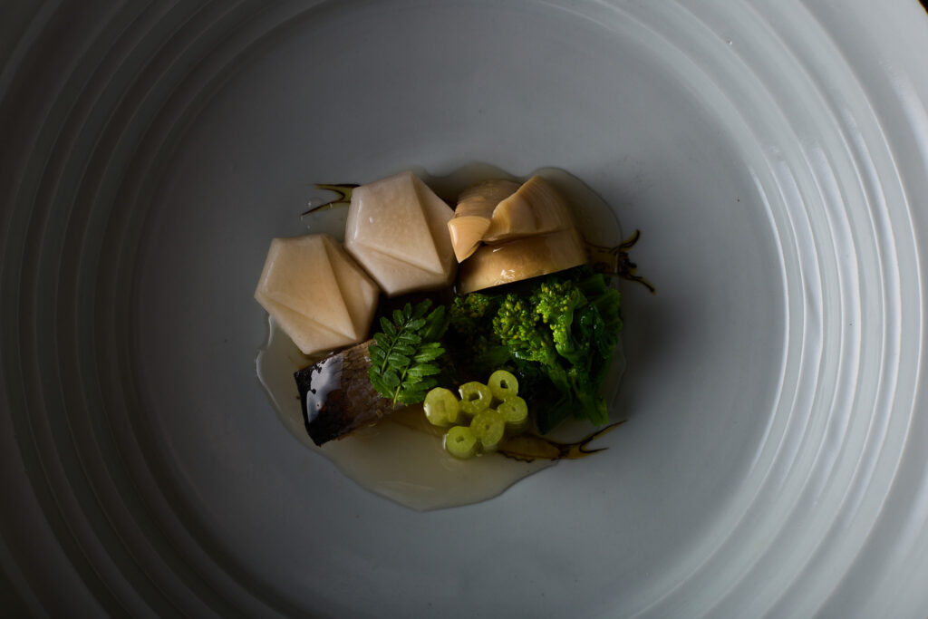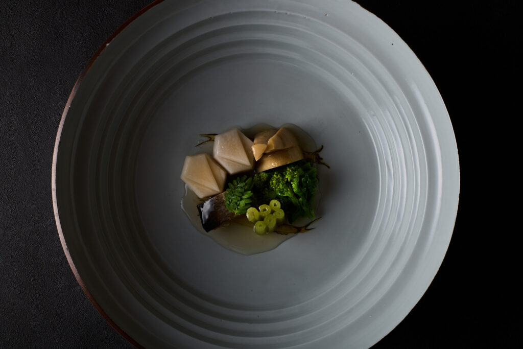 白磁の涼しげな段鉢の見込みに双魚が描かれた古九谷風の大鉢。双魚文は、魚が多くの卵を産むことから子孫繁栄の文様とされており、古陶磁に造詣の深かった魯山人が好んだ図である。高10.3×径37.5 cm