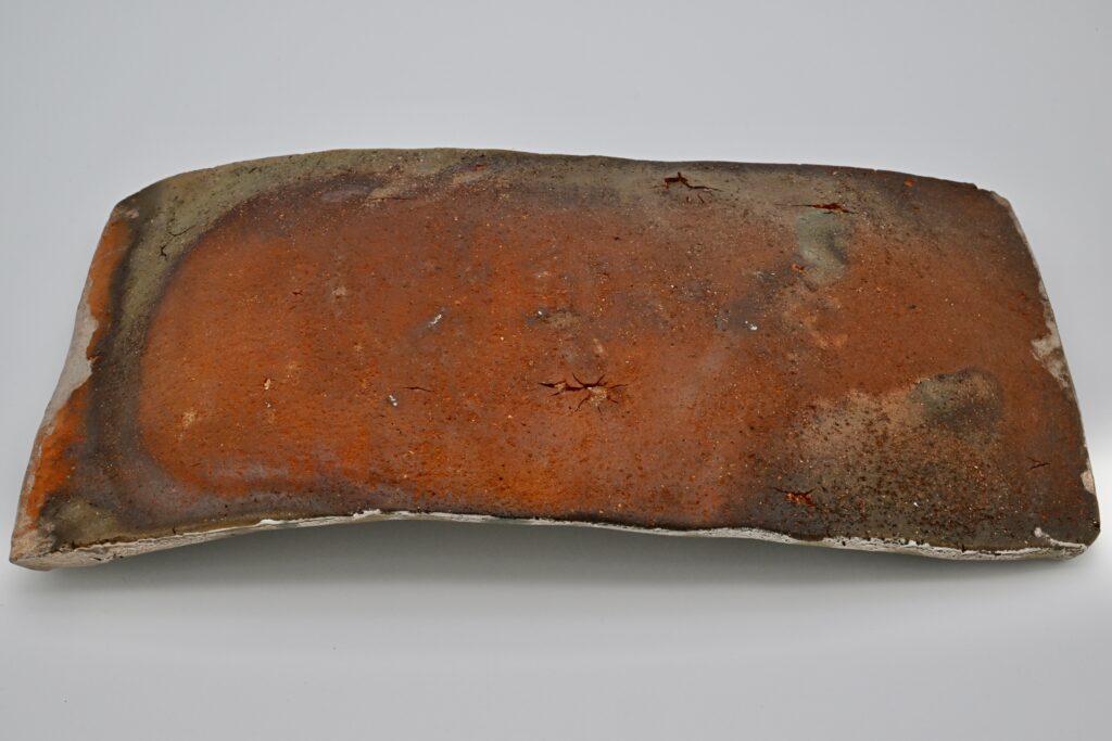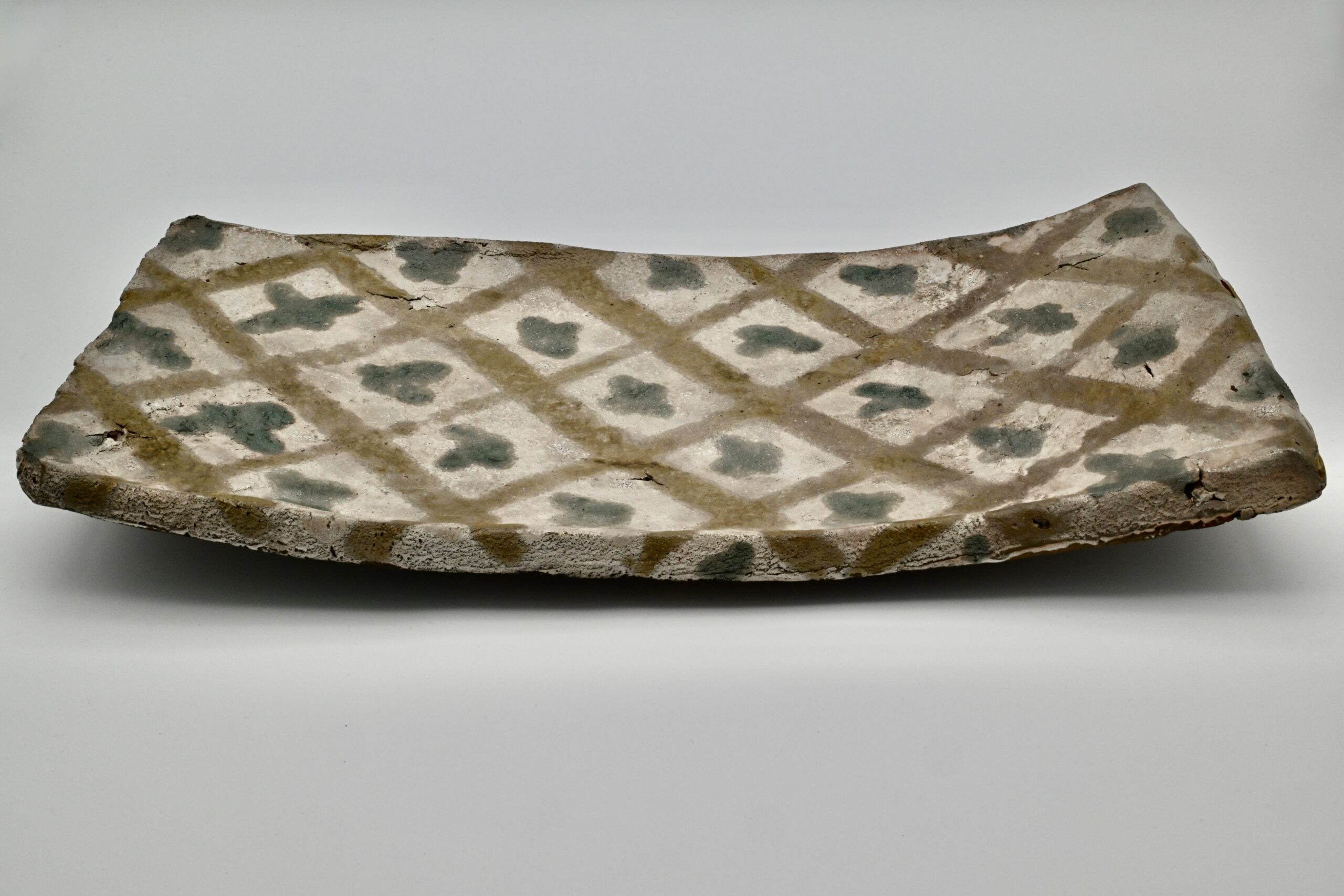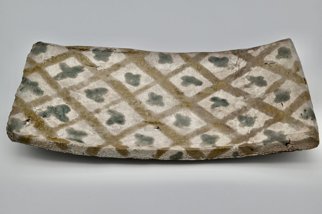 本作のように銀彩と色絵を用いた長方鉢は数少なく、魯山人作品の中でも特筆すべき逸品である。まず注目されるのは、作品の基盤となっている備前焼そのものの完成度の高さである。良質な備前土味に加え、見どころとなる大ぶりの石はぜが器面の随所に現れ、焼締陶としてのみ見ても十分に鑑賞に堪える出来であったことが容易に推察される。通常であれば、この段階で作品として完結していても不思議ではないが、魯山人はそこにとどまらない。備前の荒々しくも深みのある表情の上に銀彩と色絵を重ねて格子文を描き出すという、素材の個性を大胆に組み合わせた手法がとられている。また備前ならではの土味の上に銀彩を施すことで、銀光が適度に吸い込まれ、マットで落ち着きのある渋い表情が生まれている。そこへ色絵の柔らかな発色が加わり、素朴さと華やかさが絶妙な均衡を保つ景色となっている。緩やかに反りをもたせた長方鉢の造形は、魯山人ならではの伸びやかさを備え、料理を受け止める器としての機能性と、造形作品としての完成度を高い次元で両立している。備前・銀彩・色絵という異なる要素を一器に凝縮しながら、決して過剰に陥らない統御力は、まさに魯山人芸術の真骨頂といえる。備前焼としても、装飾陶としても一級の水準にあり、これほど贅沢な工程と表現を惜しみなく注いだ作品は稀である。素材への深い理解と尽きることのない探究心が結実した、魯山人らしさの詰まった逸品である。w41.7 × d21.7 × h5.7cm 釘彫サイン「ロ」 1950年代