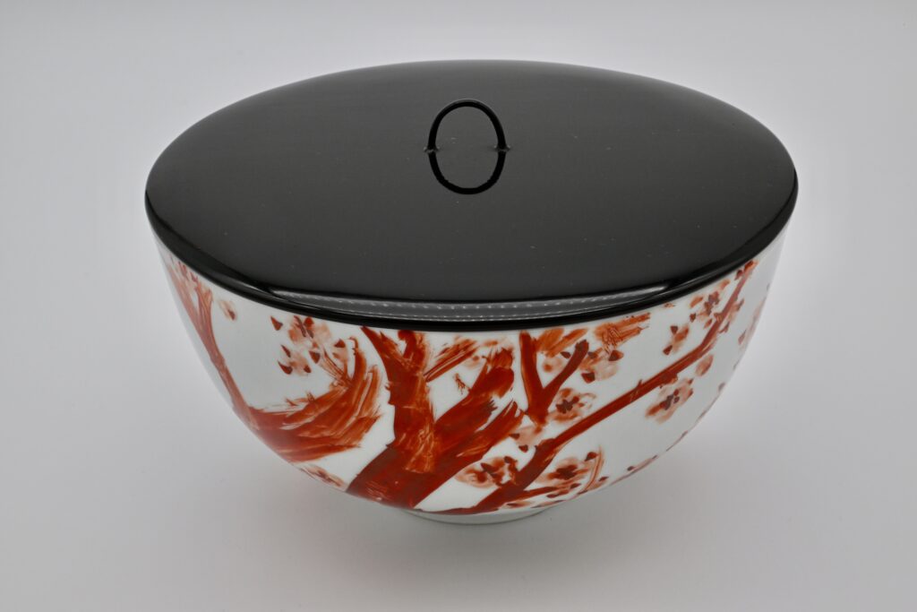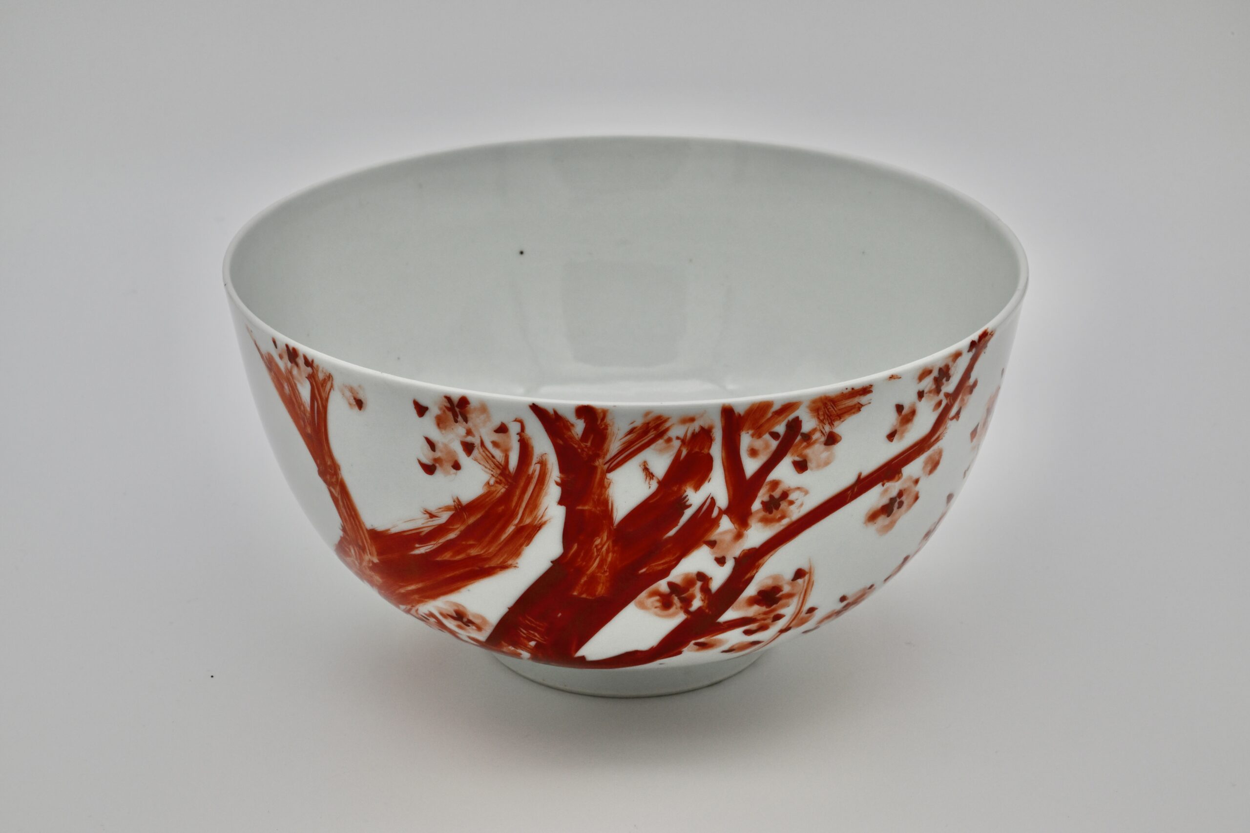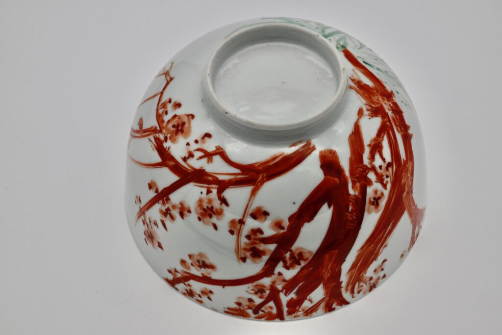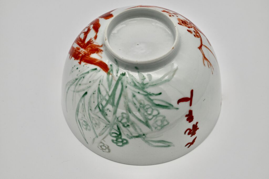 本作は、大正4年(1915)、魯山人がまだ「福田大観」と名乗っていた時代に制作された、きわめて希少な初期の色絵磁器作品である。加賀山代温泉・須田菁華のもとで、魯山人が本格的に磁器への絵付に取り組み始めた最初期の作例の一つに数えられる。白磁の器面には、片面に紅絵による梅樹と花が奔放かつ的確な筆致で描かれ、もう片面には淡く伸びる水仙の葉が配されている。構図は簡潔でありながら、画面全体に緊張感と伸びやかさが保たれ、余白を生かした画面構成には、すでに後年の魯山人作品に通じる美意識が明確に表れている。とりわけ注目すべきは、その絵付の完成度である。磁器の肌は紙とは異なり、思うように線を運ぶことが難しい素材であるが、本作ではそうした困難さをまったく感じさせない。筆は器面を自在に走り、幹の力強さ、花の柔らかさ、葉の流れが一気呵成に描き出されている。これほどの筆致が最初期段階で成立しているのは、魯山人がすでに書家として筆の扱いを身体化していたからにほかならない。書の世界で培われた筆圧、速度、間合いが、そのまま磁器上の絵画表現へと転化されている点に、本作の本質的な価値がある。器体には「大観学人」のサインが記されている。「学人」とは、特定の流派や肩書に安住せず、学び続ける者としての自己規定を示す呼称である。後年の華やかな魯山人作品とは趣を異にしながらも、書・絵・陶という三つの領域を横断する表現が、すでに高い次元で結実しており、きわめて重要な作品といえる。まだ若き日の魯山人が秘めていた非凡な才能と、その後の展開を予感させる、静かながらも強い存在感を放つ一作である。w22.2 × h12.1cm 赤絵サイン「大観学人」 1915年