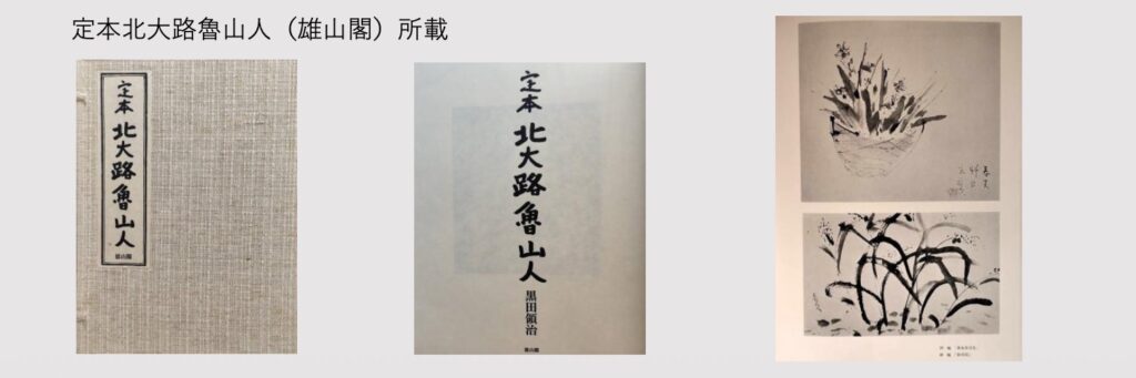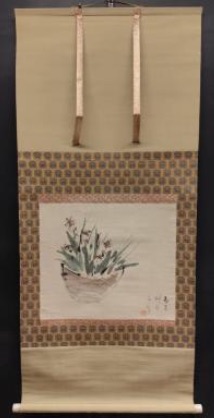本作は、籠に活けられた山野草「姫しゃが」を描いた画賛作品である。簡潔な筆致によって表された籠と草花は、写実に寄ることなく、のびやかな線と余白によって軽やかな空気感を生み出している。籠は素朴な線で構成され、そこにすっと立ち上がる葉と、可憐に咲く姫しゃがの花が配される。葉には淡い彩色が施され、墨の濃淡とあいまって、簡潔ながらも奥行きのある表現となっている。画面右下には「春来艸自生」との賛が添えられる。これは「春来たりて草自ずから生ず」と読み、春の訪れとともに草花が自然に芽吹くさまを詠んだ言葉である。人為を超えた自然の理に従い、静かに生命が立ち現れる情景を示すものであり、本図の主題と響き合っている。姫しゃがは、山野にひっそりと咲く小ぶりな花で、控えめで清楚な趣をもつ植物として知られる。その姿は、華やかさよりも自然の中に息づく繊細な美を象徴するものであり、魯山人が好んだ山野草の感覚にも通じる。さらに本作の軸先には、魯山人自作による志野の軸先が用いられている点も特筆される。書画のみならず、軸先にまで自らの美意識を及ぼした例であり、このような取り合わせはきわめて稀少である。簡素な構成の中に、自然の息吹と静かな詩情をたたえた一作であり、書画一体の表現を得意とした魯山人の資質がよくあらわれている。額:w61.0×h145.0cm(画:W47.0×H42.0㎝) 右下に賛「春来艸自生 魯山人」 朱角印・随禄艸堂 軸先も魯山人作・志野 鉄絵でサイン「ロ」 1930年代