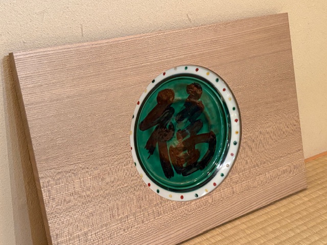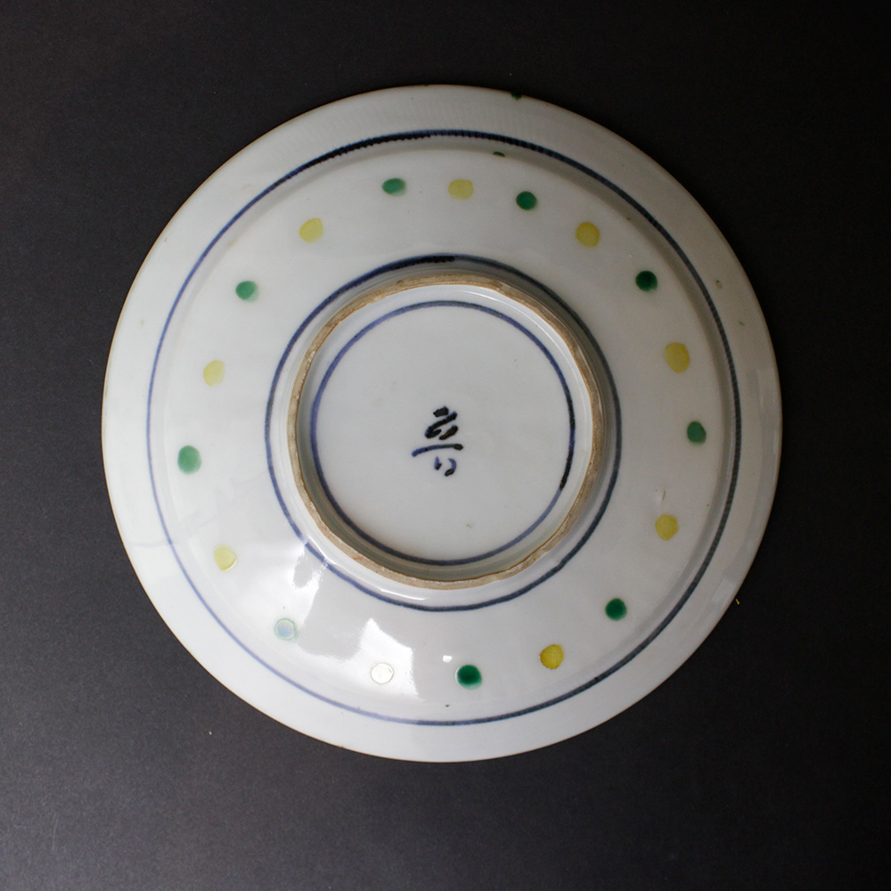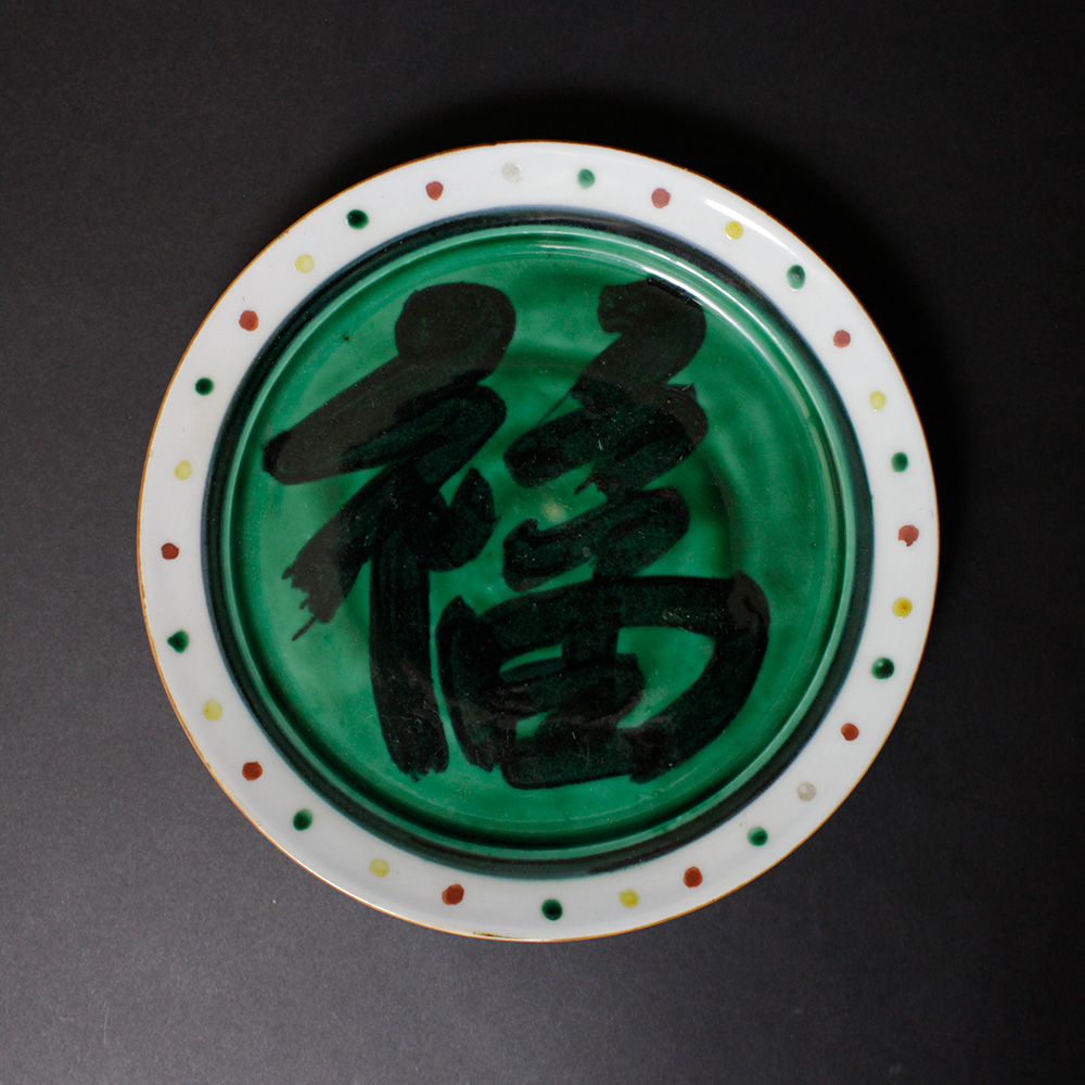 多くの福の字皿を作った魯山人先生ですがこの色絵の福の字皿は大変稀少な作品です。籠字で福の字を染付で書き、緑釉で施しています。縁には赤、黄、緑の水玉を配しています。また口縁には口紅を施し作品を締めています。裏面を見てみれば、回らせた染付の円状の円状の中に、緑と黄釉の水玉を交互に配しています。高台内には「魯」の染付銘があります。『THE ART OF ROSANJIN』や『入門 魯山人の陶器』に所載作品です。 21.6/H3.2cm