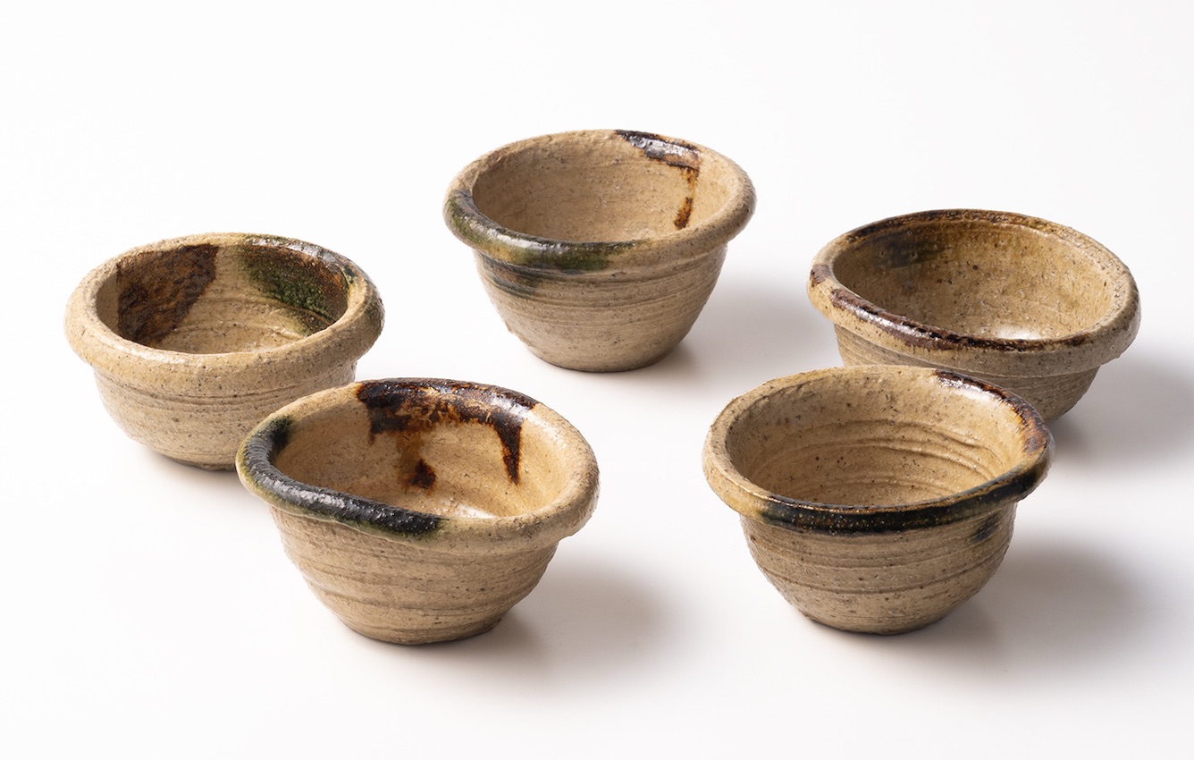 轆轤成形で土を引き上げた後に、口縁をそれぞれに捻り返しています。裏返すとまるで帽子形に、あるものは酒呑形になっているものも楽しませてくれます。黄瀬戸の上がりは最良で、口縁に付けられている鉄釉と胆礬は無作為に配されていてリズムを感じます。また黄瀬戸を背景に発色が美しく、こうした小品でありながらとても魅力的な器になっています。畳付に「ロ」の彫銘があり、晩年の作品であることが分かります。 10.0 ~10.8 / H4.8~5.4cm