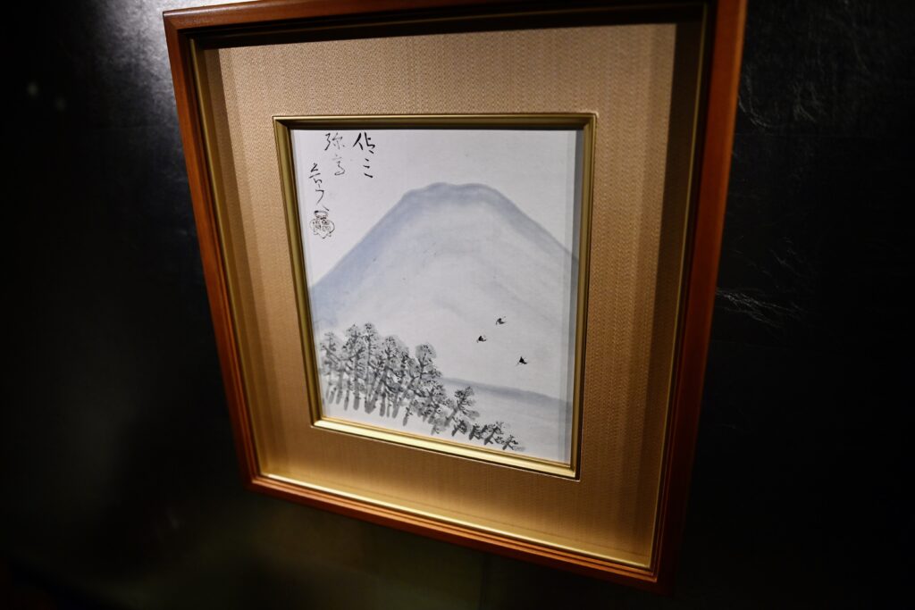 「佔之弥高」-これを うかがえば いよいよ たかし-と賛が入り、論語の「仰之弥高」-孔子の徳は仰ぎ見れば益々高く感じる-を応用したもので、富士山と松原が丁寧に描かれています。魯山人が色紙に書くのは頼まれその場の即興が多く、この絵のように絹本で描かれているような細かく力を入れた絵はほとんどありません。絵も好きで上手な魯山人、色紙の絵では一番の名作と思われます。・昭和30年(1955)頃の作品
