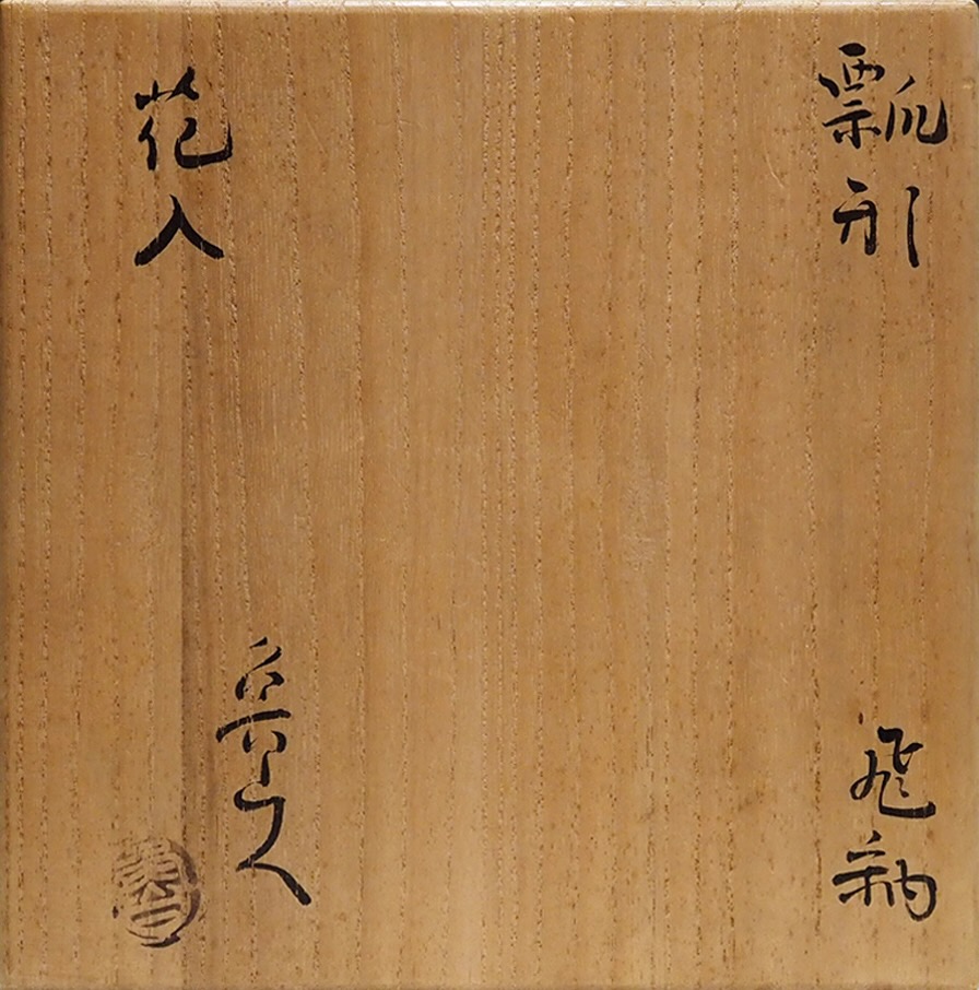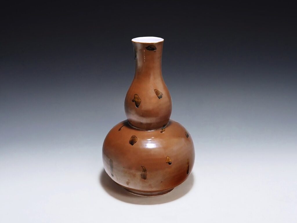 大変珍しい花入です。瓢型は数が少なく、飛釉もほとんど見ません。型により成形された瓢型はどっしりとし安定感があり、丸みのある曲線がとても美しいです。磁器による柿釉の発色が綺麗でポンポンと不自然に施された飛釉の感覚が魯山人らしく特有で落ち着きが有り素晴らしいです。テーブル席や部屋のどこに置いても落ち着き、勿論床の間も引き締まります。どんな花を生けようか楽しみになり、又そのまま飾っても美しい魯山人の素晴らしい作品です。・昭和15年(1940)頃の作品