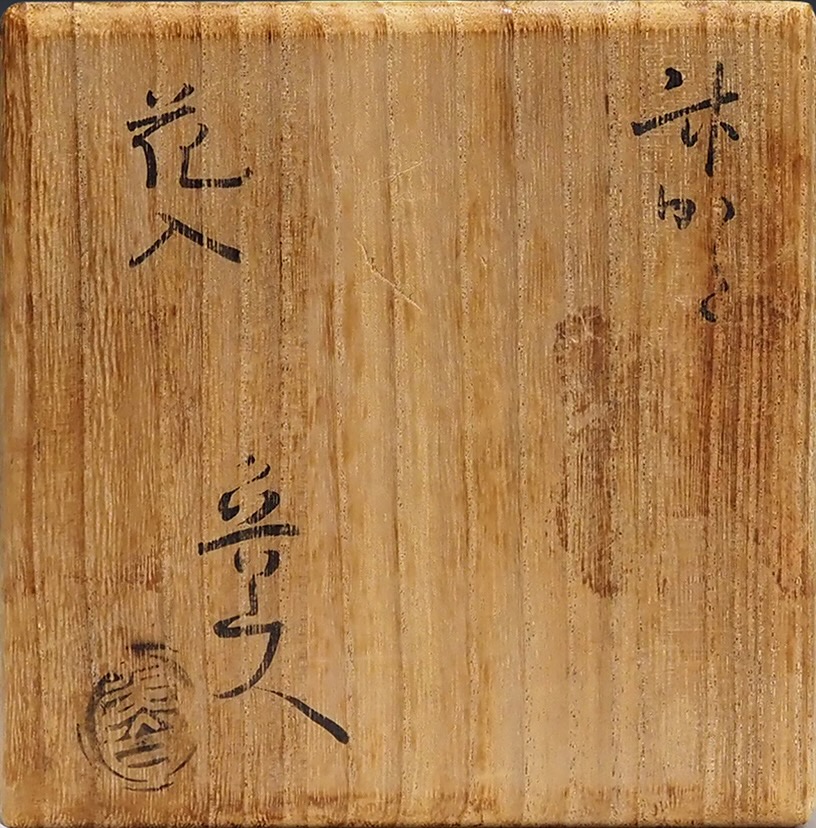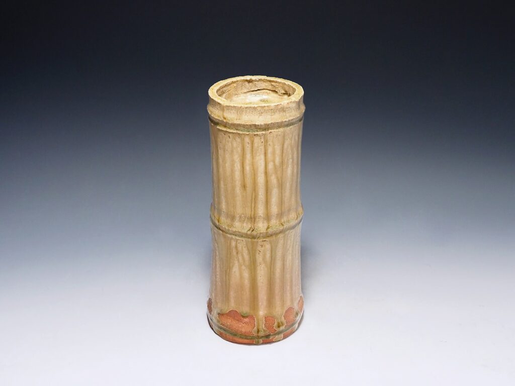 竹形の花入は、とても様子が良く、魯山人特有な焼き物の内の一つです。千利休以来、竹の花生けはとても人気が高く、現在でも茶道を好む人に限らず、たくさんの人が作ったり使ったりしています。魯山人はこの形の焼き物を多数作りましたが、この作品は、特に伊賀釉の掛かり方が素晴らしく、とても綺麗な発色をしています。床の間にも勿論、テーブル席や部屋のコーナー等和洋を問わず何処に置いても合う魯山人らしい作品です。・昭和13年(1938)頃の作品