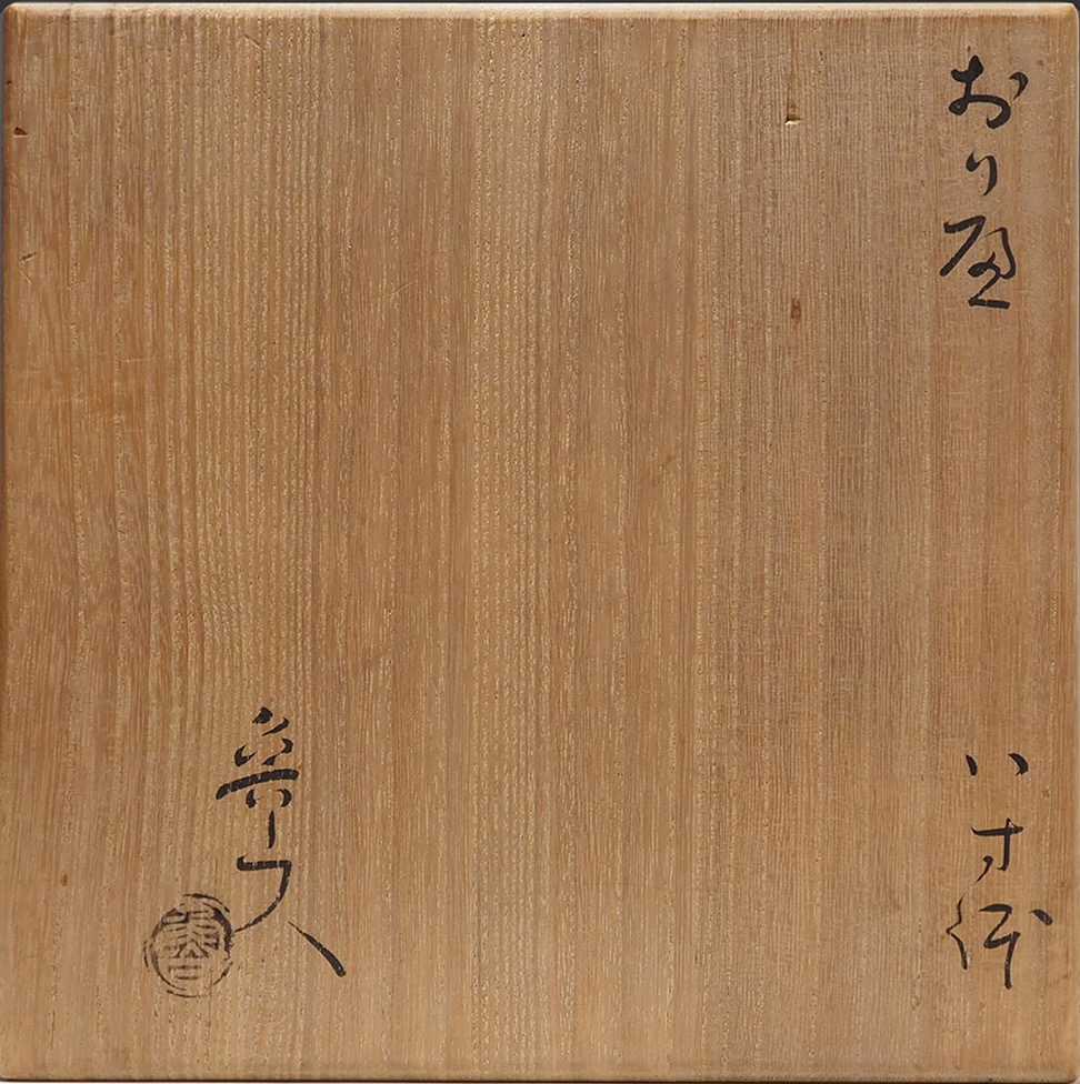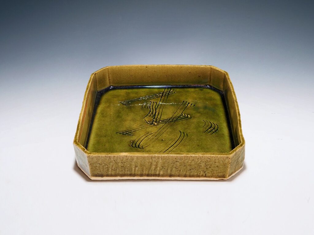 隅切りをし立ち上がりは塗り物の重箱を連想させる、魯山人らしい形の八寸鉢です。1955年から二度に亘り、織部焼での「人間国宝」指定を断っています。晩年は金銭事情が悪く、奨学金も入るのに、国(芸術が解らぬ)が決めるものは受けたくなく、他の指定者とは別格と思っていたのでしょう。その織部釉を全面に施し、見込みに櫛目で「寿」の字を書き、めでたい席で使うと食材が無くなるととても嬉しいです。珍しい形も品が有り使い易い素晴しい八寸鉢です。・昭和12年(1937)頃の作品
